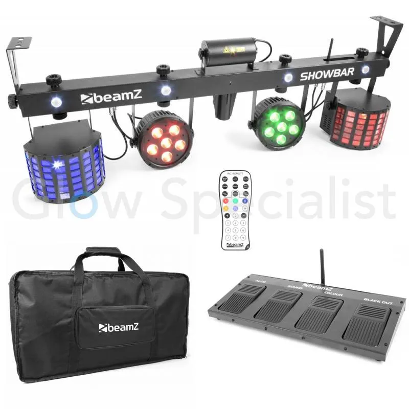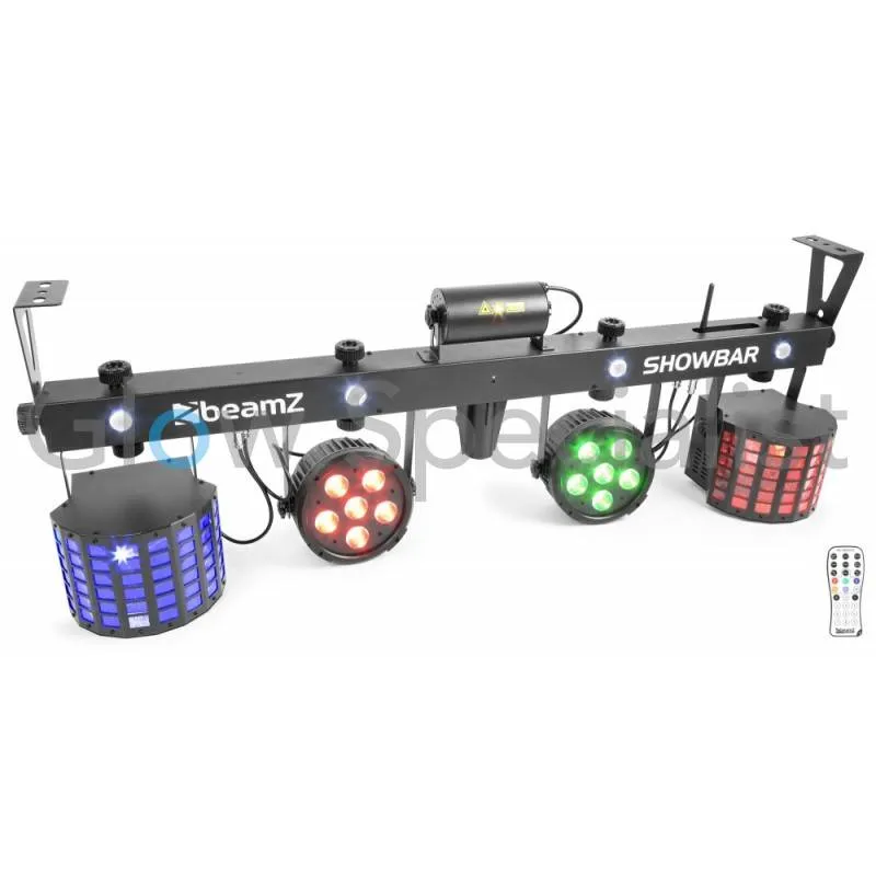 De Showbar bestaat uit een tweetal LED Butterfly-style effect lichten, een tweetal LED pars, een krachtige groene en rode laser en een stroboscoop. De T-bar bevat 4 ingebouwde 1W high power witte LED’s die een verbazingwekkend strobe effect creëren.