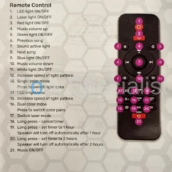 De lichtprojector projecteert je mooiste patronen op je plafond, alsof je naar de sterrenhemel kijkt. Je hebt keuze uit 21 lichteffecten dus er zit altijd wel iets voor je bij. De speaker is te bedienen via de afstandsbediening (meegeleverd), dus je hoeft er niet eens voor op te staan.
