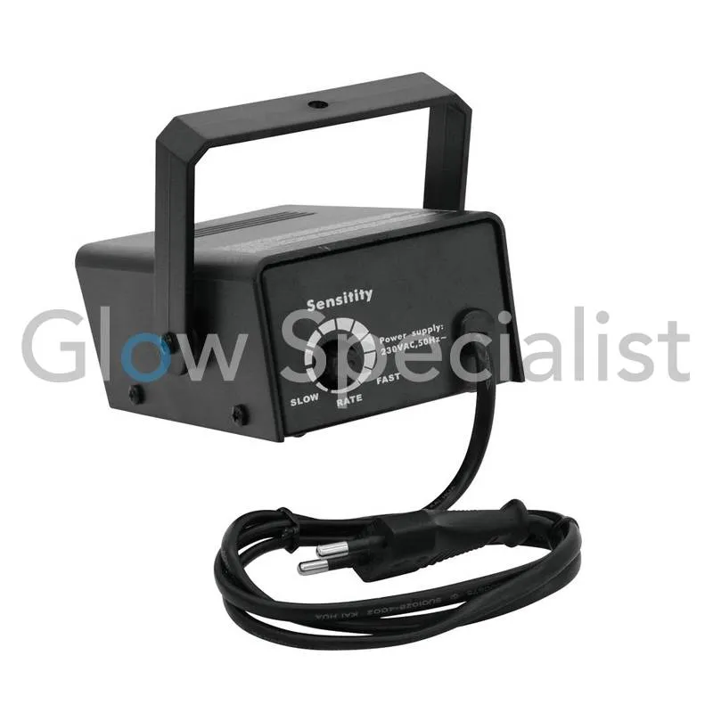 Deze kleine Disco-strobe is instelbaar door middel van een draaiknop op de achterzijde.