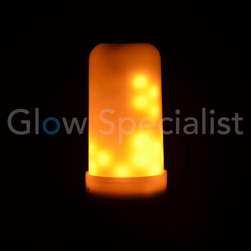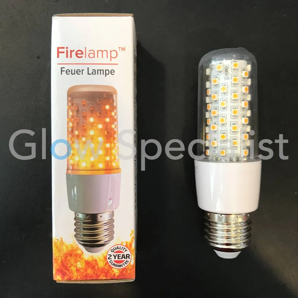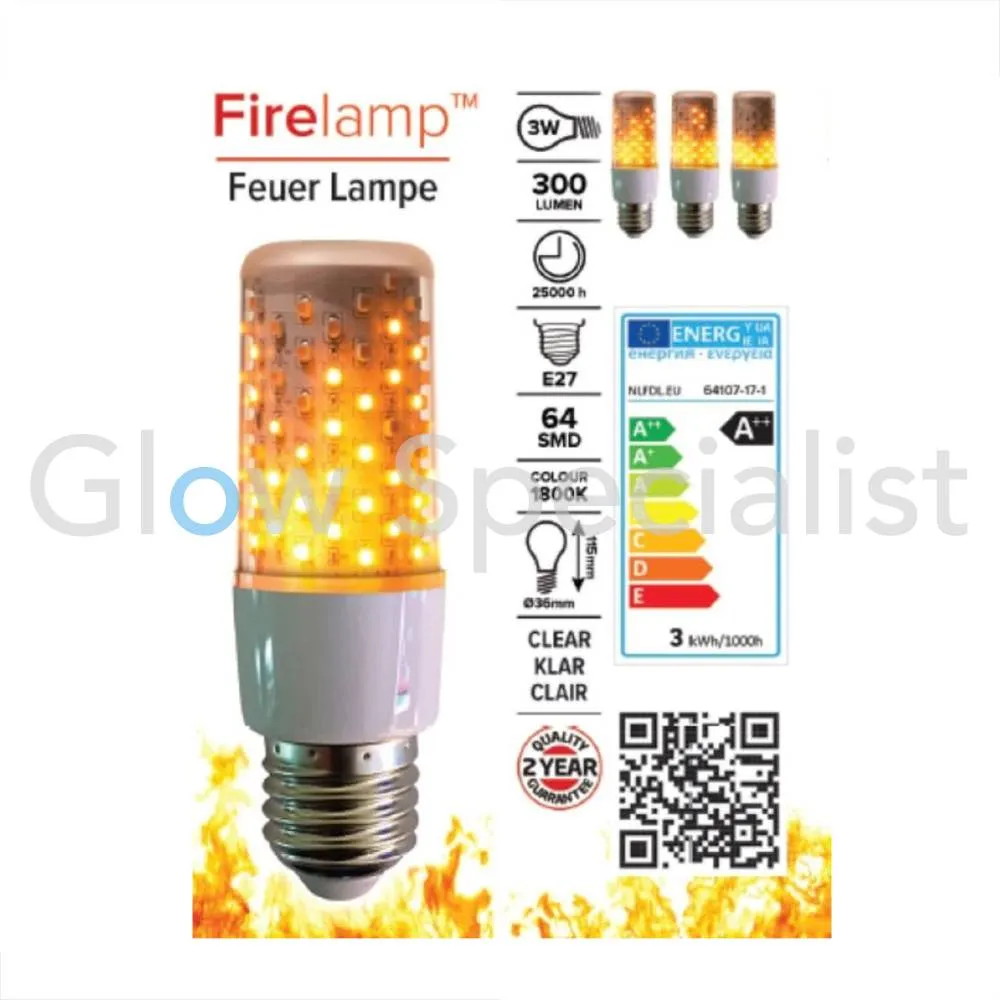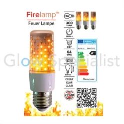 Firelamp E27M-64smd HELDER simuleert een actieve vlam d.m.v. ingebouwde software gekoppeld aan 64 SMD leds. Kan buiten gebruikt worden mits de lantaarn de lamp droog houdt. Geeft sfeer maar ook ca 300 lumen licht! (ca. net zoveel licht als een traditionele 25W lamp).