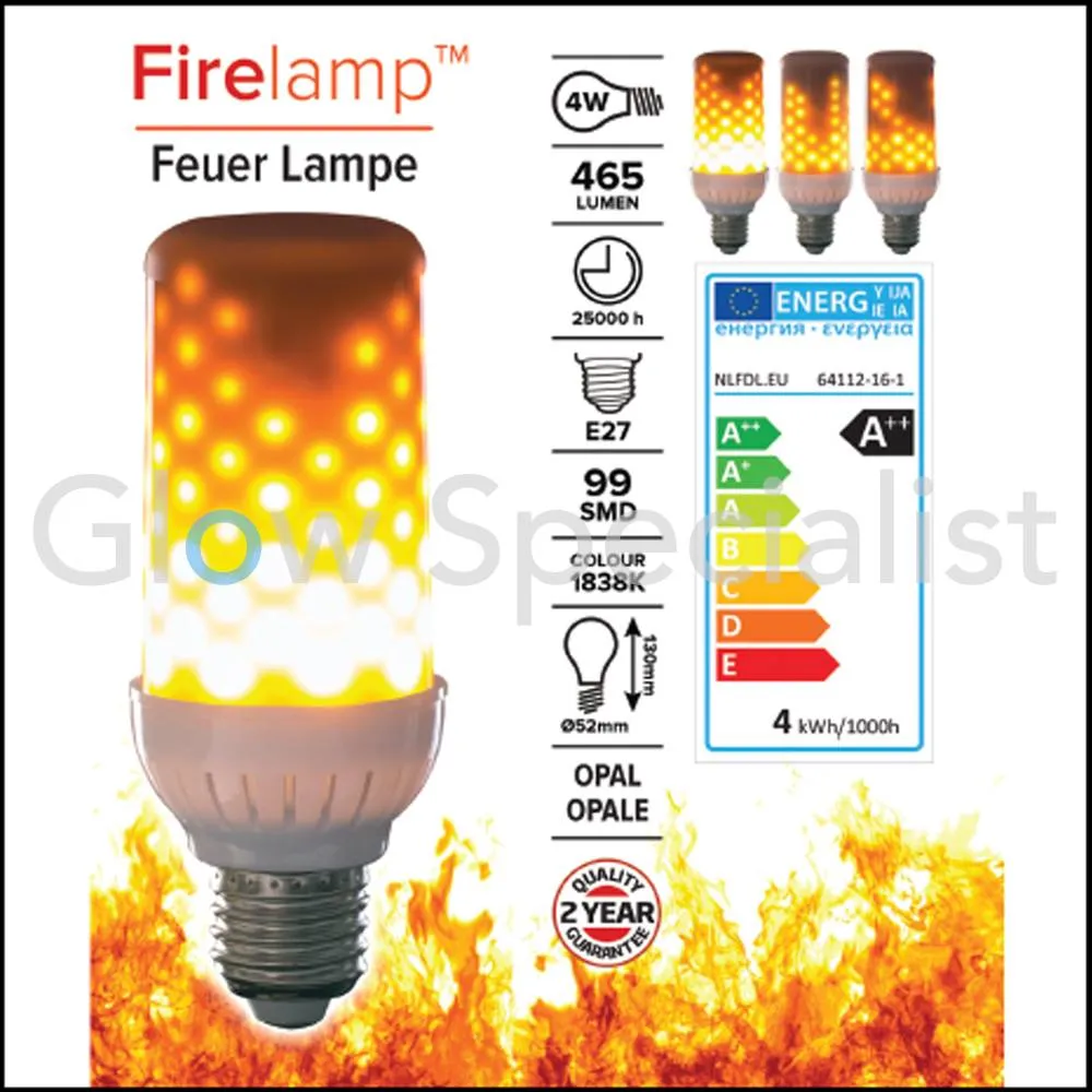 Firelamp simuleert een actieve vlam d.m.v. ingebouwde software gekoppeld aan 96 SMD leds. Kan buiten gebruikt worden mits de lantaarn de lamp droog houdt. Geeft sfeer maar ook ca 465 lumen licht! (ca. net zoveel licht als een traditionele 40W lamp).