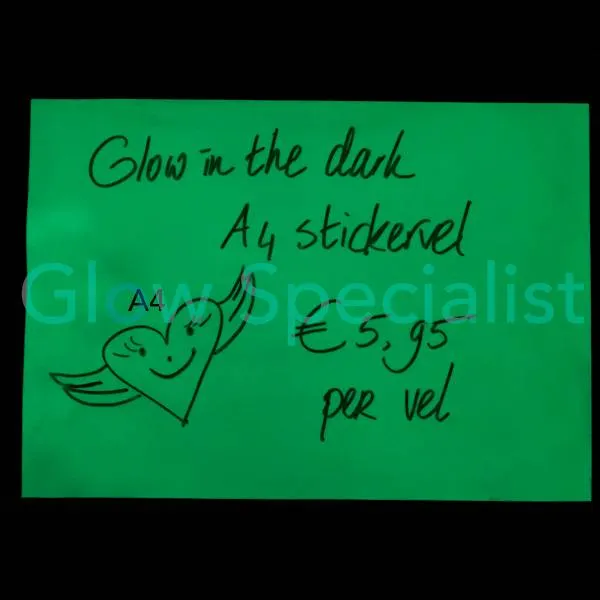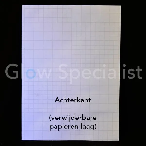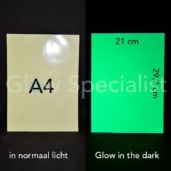 Hoge kwaliteit A4 glanzend vinylpapier dat fel oplicht in het donker, met aan de achterzijde een plaklaag. Je kunt er op schrijven (met een permanent marker), je kunt het ergens opplakken en je kunt er vormen en figuren uit knippen. Op de achterkant van het vel staat een raster waarmee je het A4 vel makkelijk in kleinere formaten kunt knippen.