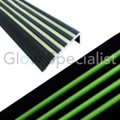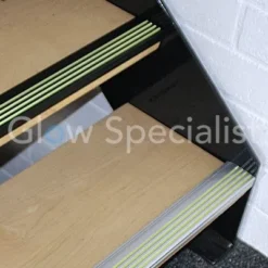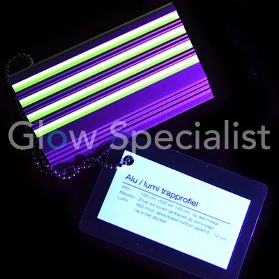Lichtgevend trapprofiel: zeer fraai van zware kwaliteit met aluminium antislip ribbels. Ertussen is hoogwaardige luminescerend materiaal aangebracht van 450 mcd. Na opname van 5-10 minuten dag- en/of kunstlicht geeft dit profiel ca. 8-12 uur nagloeitijd.