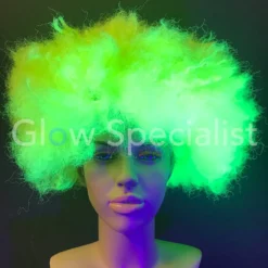 Deze opvallend neon groene damespruik vrolijkt elk feestje op. Geschikt voor Carnaval, disco/70’s feest en blacklight/glow party’s. Deze feestpruik heeft een afro model met volumineus krullend haar en is fluorescerend bij blacklight.