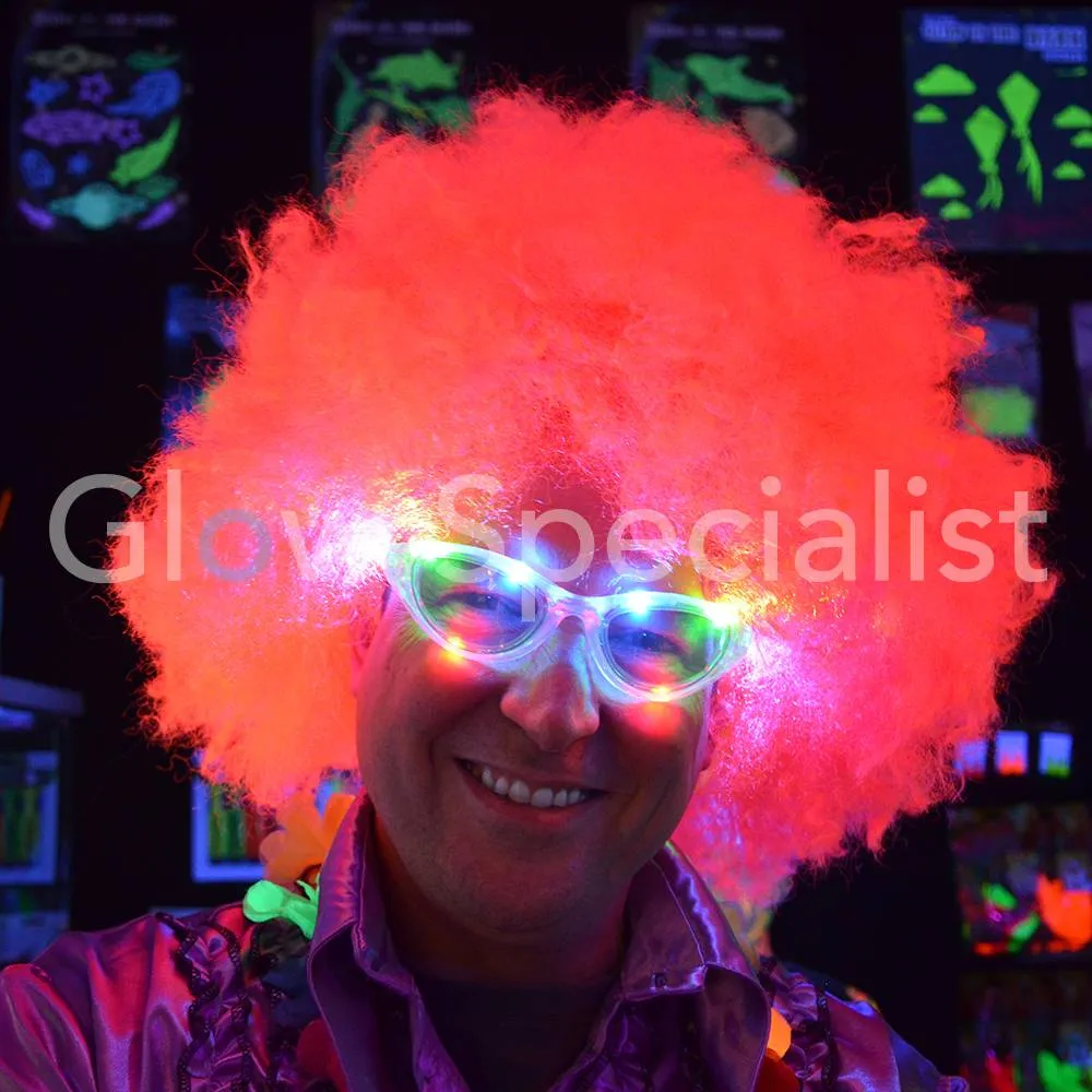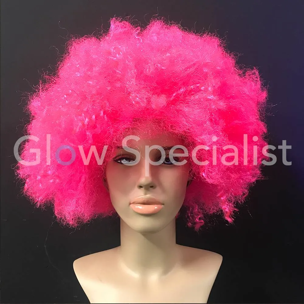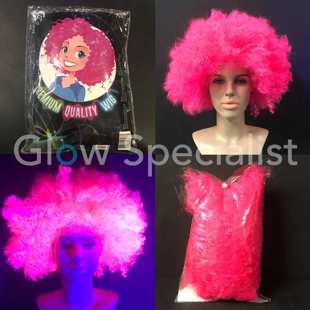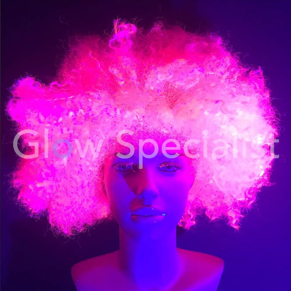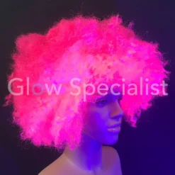 Deze feestpruik heeft een afro model met volumineus krullend haar en is fluorescerend bij blacklight.
