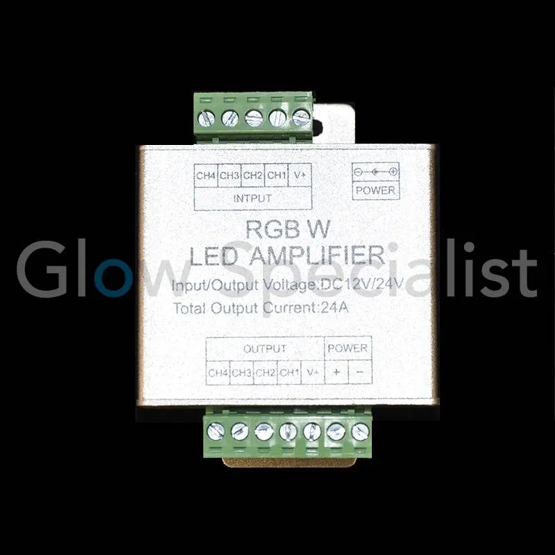 LED-versterker geschikt voor RGBW LED strips, armaturen of andere armaturen. Met behulp van een versterker kunt u meerdere RGBW strips aansluiten op één controller. In theorie zou u met deze versterker en slechts één controller een onbeperkt aantal LED strips kunnen aansturen.