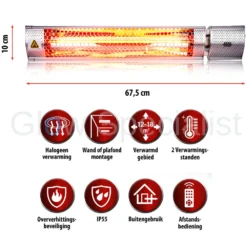 Geleverd met montage set met beugels en schroeven. De terrasverwarmer is kantelbaar waardoor je de warmte goed kan richten. De afmeting is ca. 67,5 x 10,5 x 7 cm.