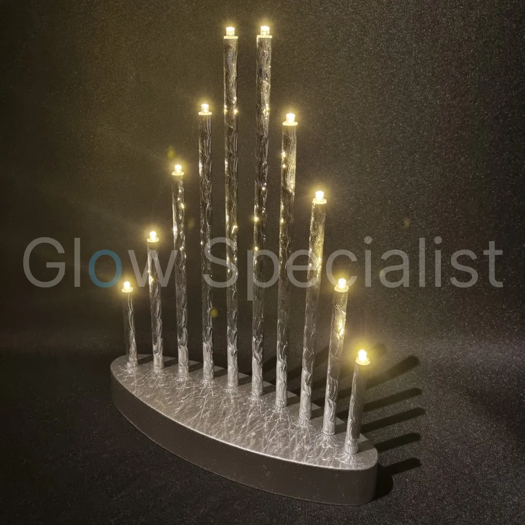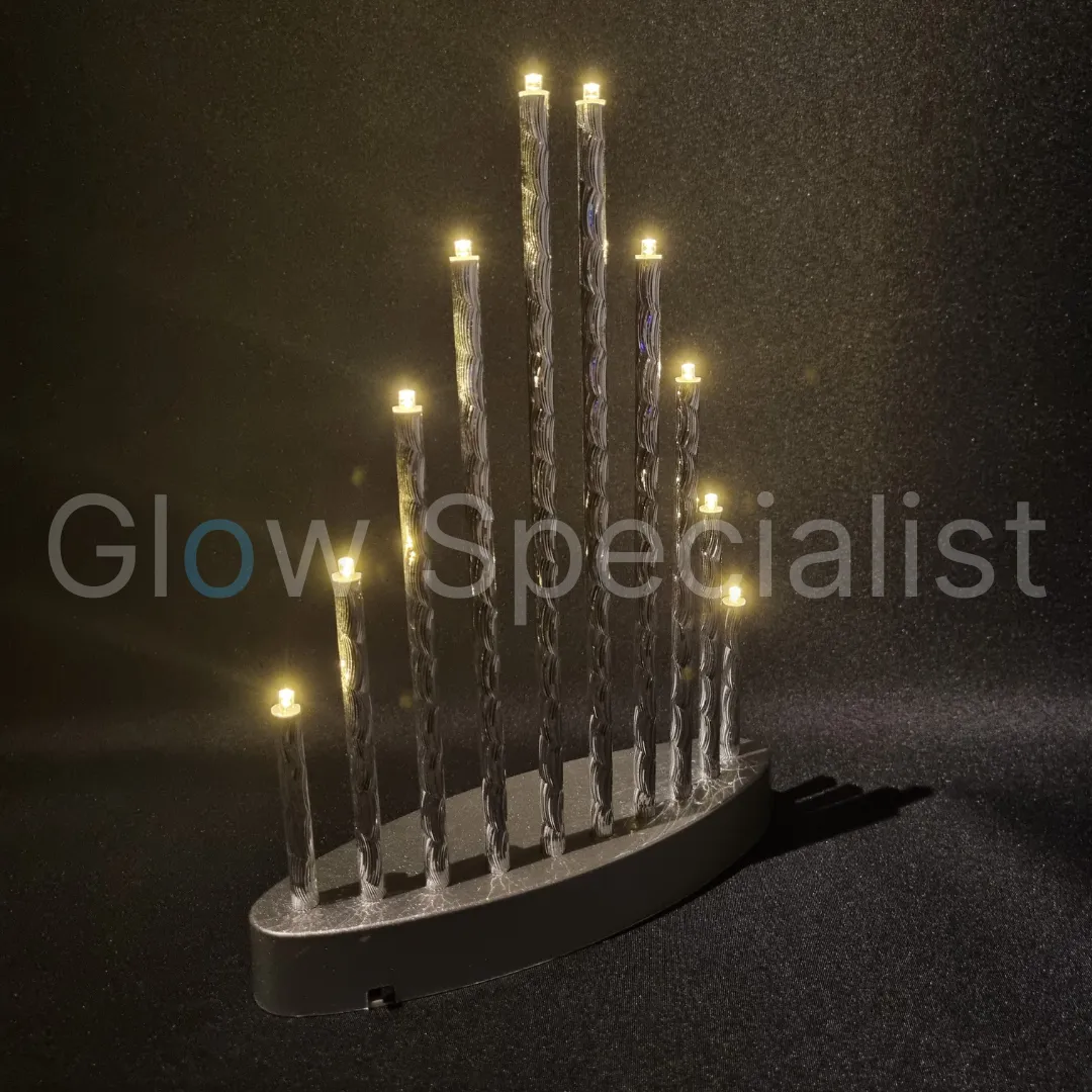 Bijvoorbeeld met deze decoratieve kaarsenbrug met 10 warm witte kerstlampjes. De kunststof staafjes zien eruit als glasstaafjes. De standaard heeft een metaalkleurige look. Voor sfeervolle verlichting in de vensterbank of voor het raam.