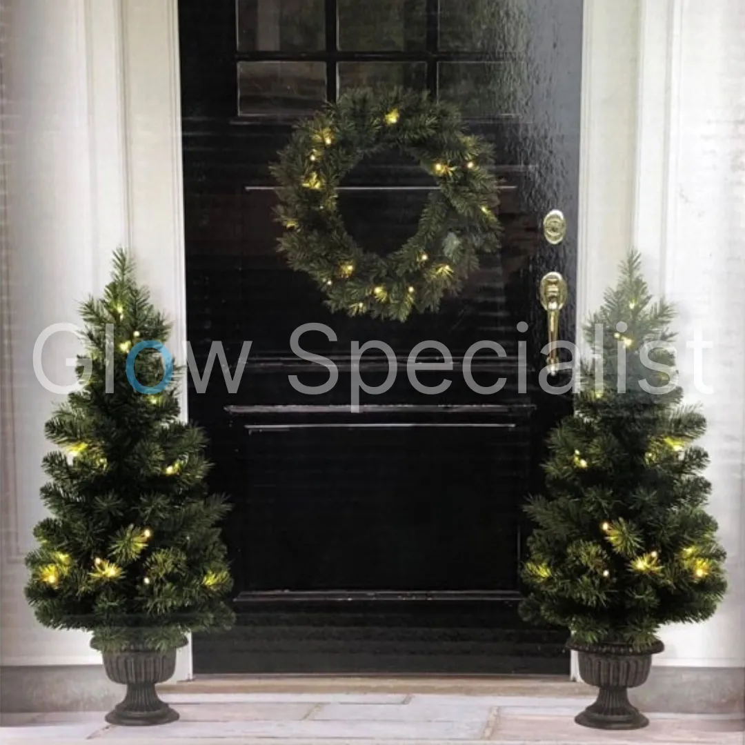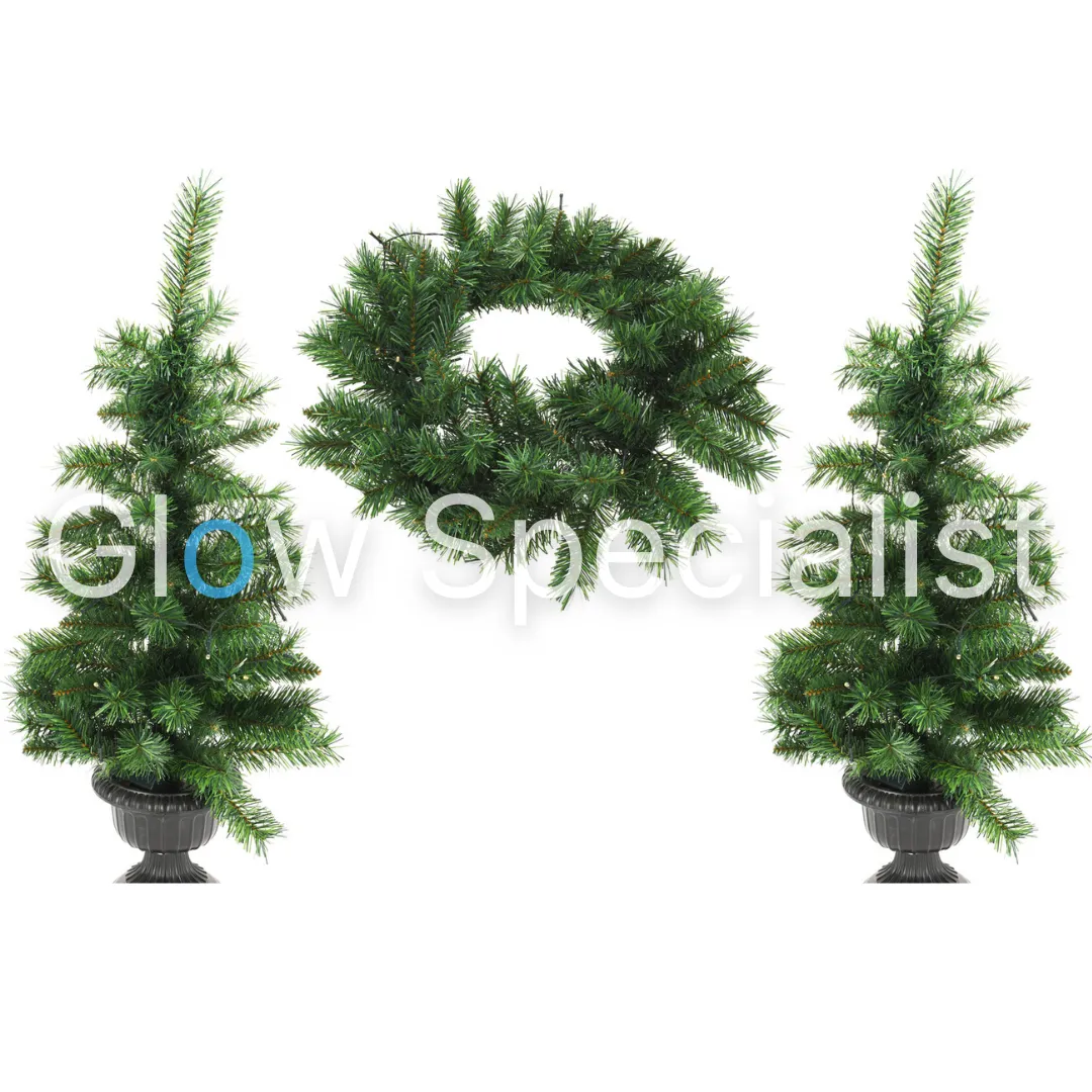 Deze 3-delige set bestaat uit twee kerstboompjes om aan beide kanten van de voordeur te zetten en een kerstkrans om aan de deur te hangen. Zo creëer je een echt Amerikaans kersthuis.
