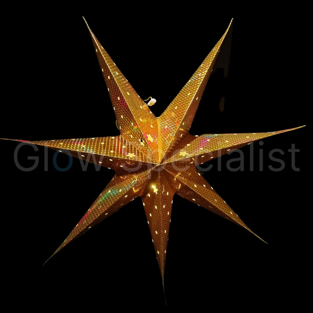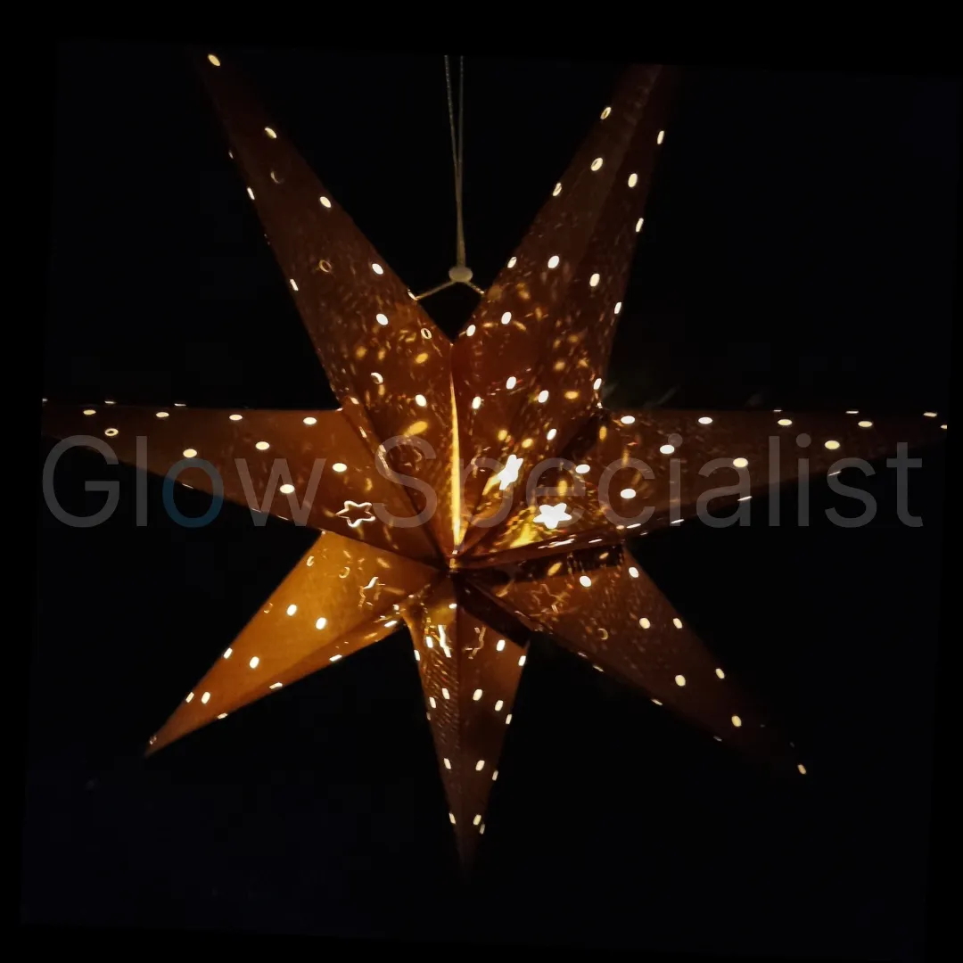 Deze zevenpuntige papieren ster schittert door een opvallend gestanst patroon, waardoor het warme led licht schijnt. De ster is 60 cm doorsnee en verkrijgbaar in goud en zilver. Het gladde papier met glitterpatroon geeft de ster een luxe uitstraling, helemaal als het licht door de rondjes en sterretjes heen schijnt.
