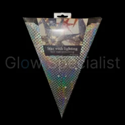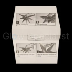 De ster is eenvoudig uit te vouwen. Zorg dat de punten goed openvouwen, plaats de led lights met batterijen in de ster en verdeel de lampjes over de punten. Vouw de ster dicht en schuif het koordje aan zodat de opening sluit. Aan hetzelfde koordje kun je de ster ophangen. Mooi als kerstdecoratie, maar ook de rest van het jaar!