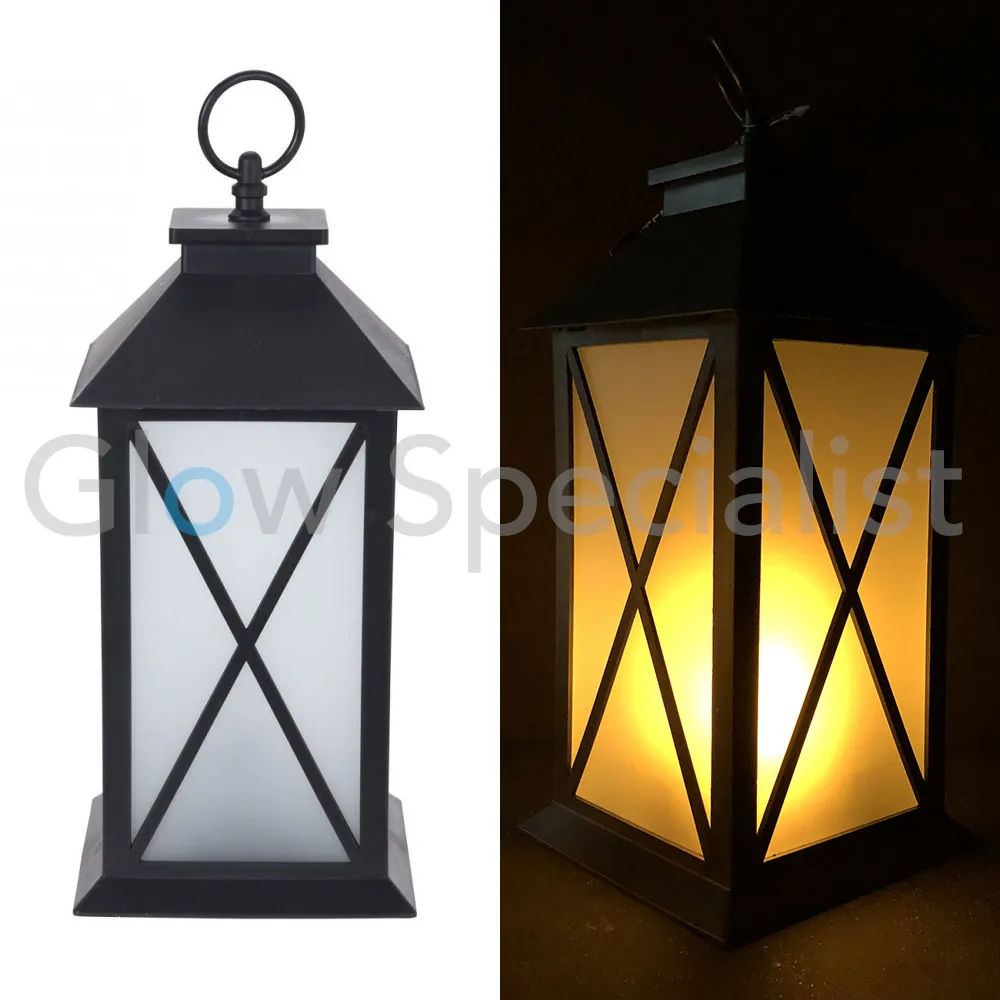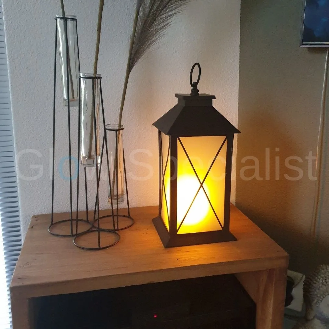 Combineer de gezelligheid van vroeger met de functionaliteit van nu, met deze lantaarn met vlam/vuureffect. Deze zwarte lantaarn werkt op LED-verlichting, waardoor je hem niet zelf aan hoeft te steken. Het warme gele licht flakkert achter het matte (kunststof) glas, net als een echte kaars.