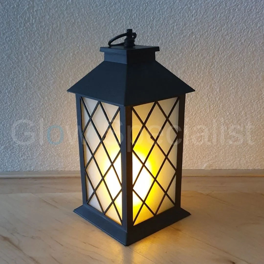 Deze moderne lantaarn heeft een frame met een ruitvorm erin en de afmetingen zijn: 28 x 14 x 14 cm. Je kunt ‘m met een knopje activeren of kiezen voor de ingebouwde timerfunctie. Hierbij brandt de LED verlichting na inschakelen gedurende 6 uur, waarna hij automatisch uitschakelt.
