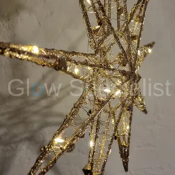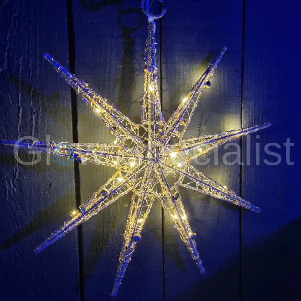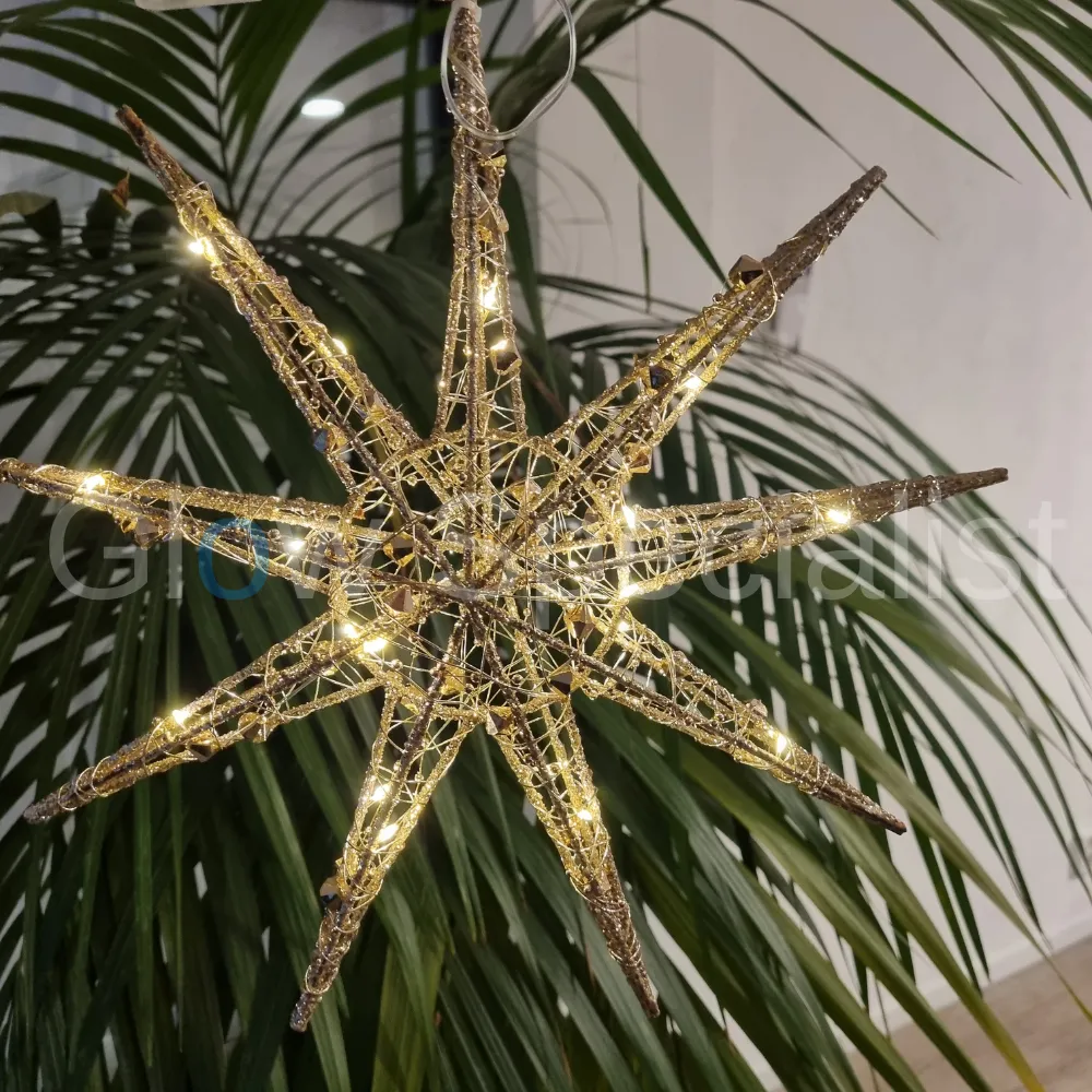 De ster is 30 cm x 30 cm en hol van binnen. De ster is gemaakt van ijzerdraad en versierd met gouden kunststof diamantjes en gouddraad met 20 led lampjes die warm wit licht geven.