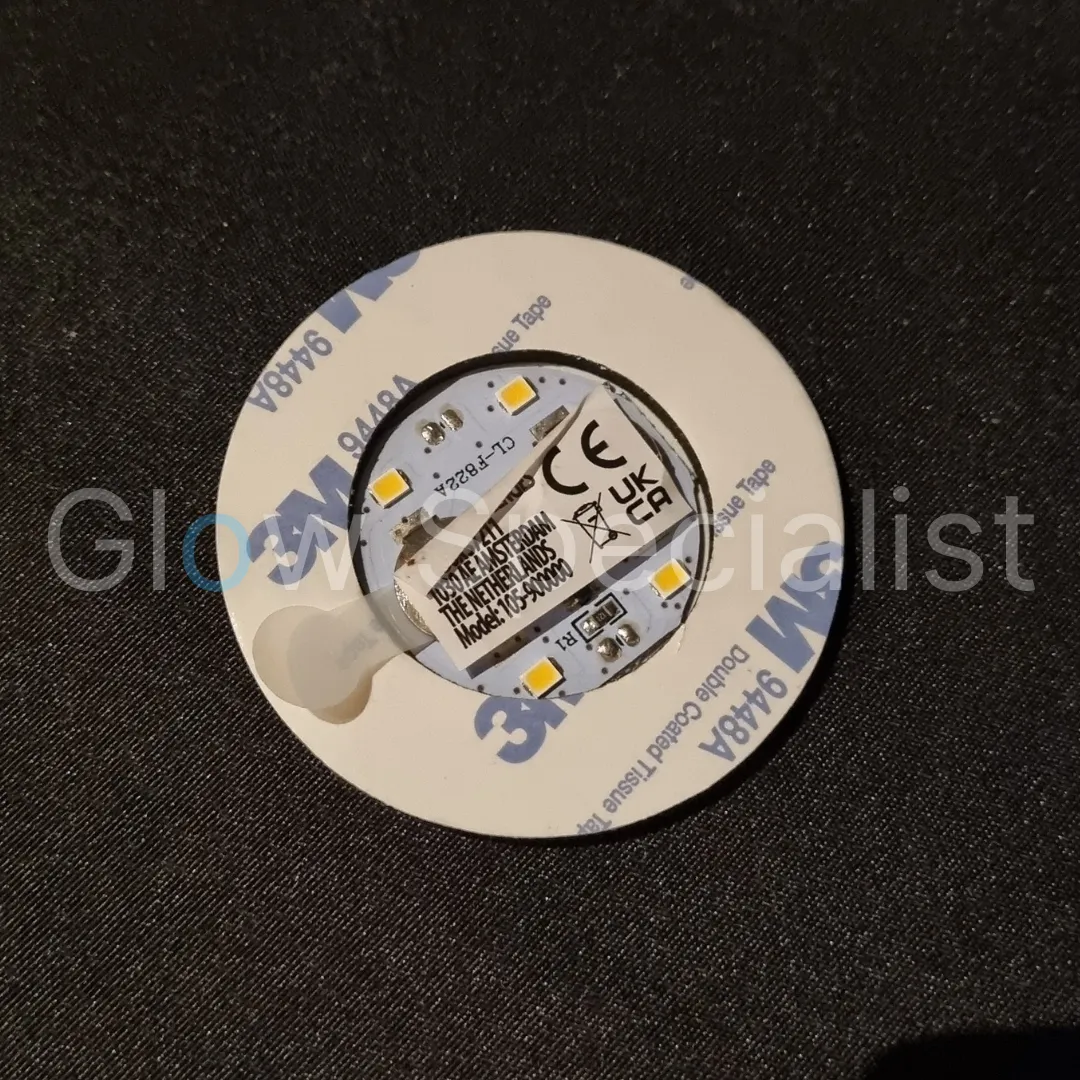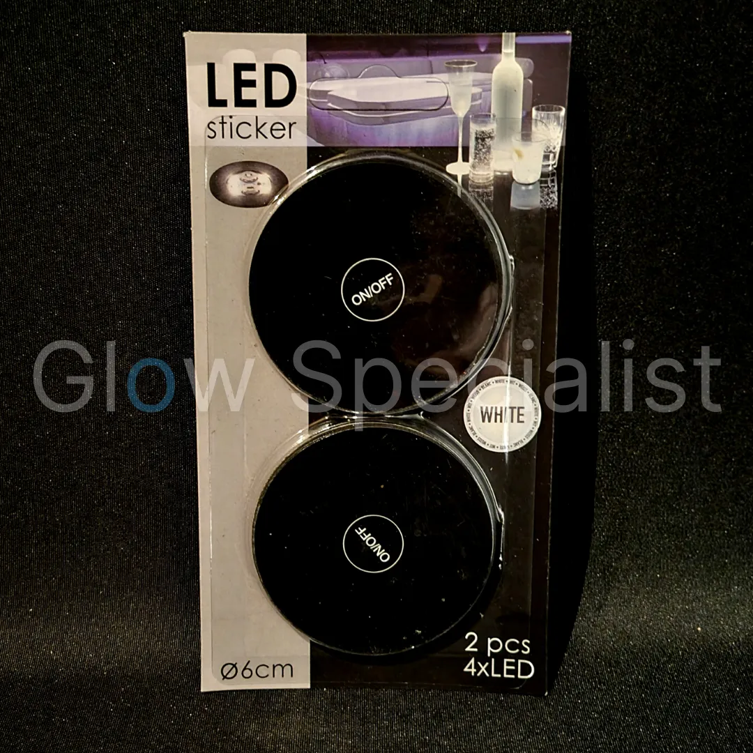 Deze ronde stickers met een diameter van 6 cm zijn voorzien van zelfklevende rand waardoor je ze eenvoudig onder een voorwerp plakt. In het midden zitten twee celbatterijen (inclusief) en vier witte LEDjes. Als de LED verlichting brandt, straalt het licht naar boven en wordt wat op de sticker staat / plakt verlicht.