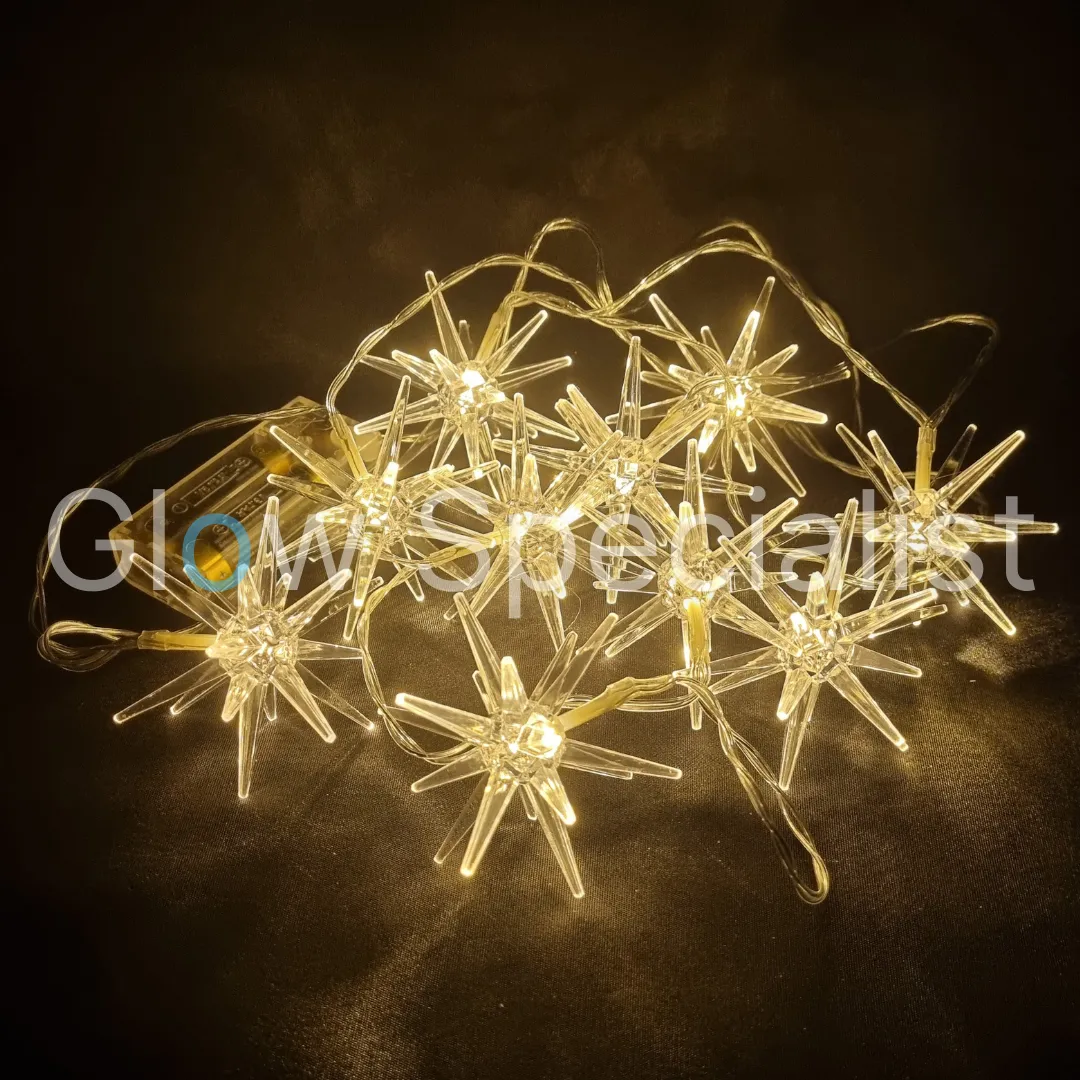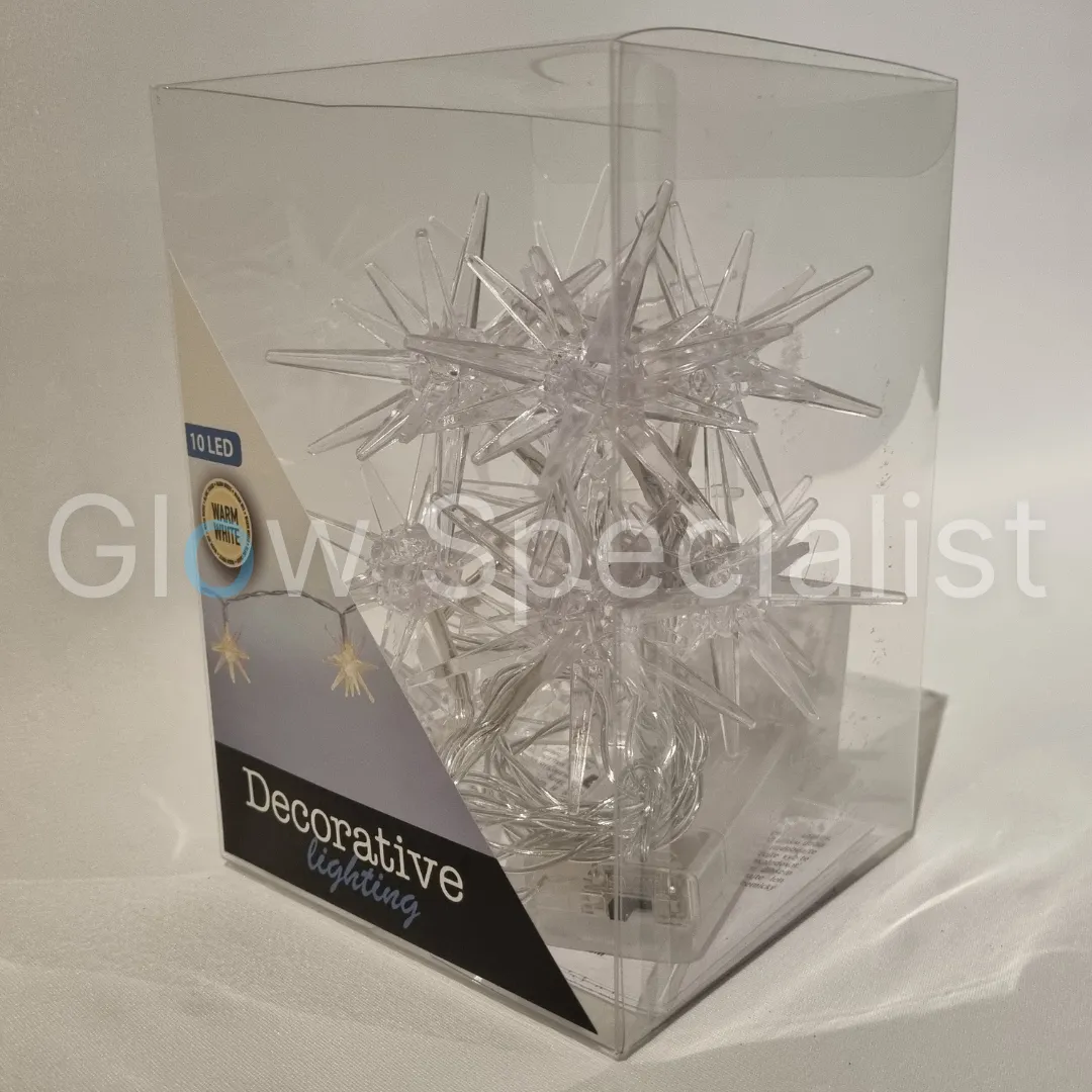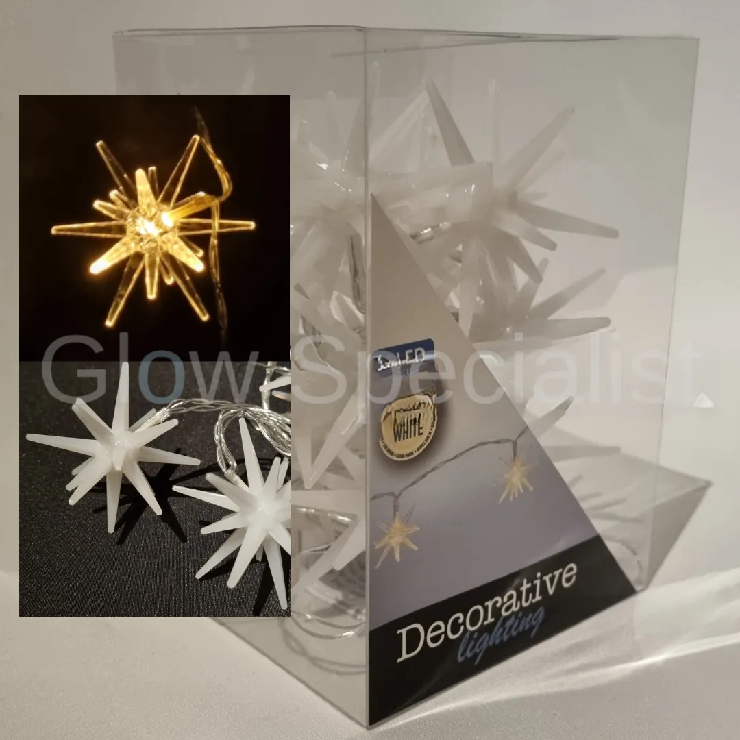 Met 30 cm snoer tot aan de batterijhouder en 15 cm ruimte tussen de lampjes. De sterren hebben een doorsnee van 7,5 cm. We hebben keuze uit twee versies: witte sterren en transparante sterren. De sterren zijn gemaakt van kunststof, maar de witte sterren lijken een soort melkglas en de transparante sterren hebben een glas-look.