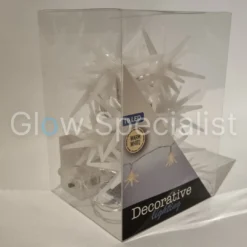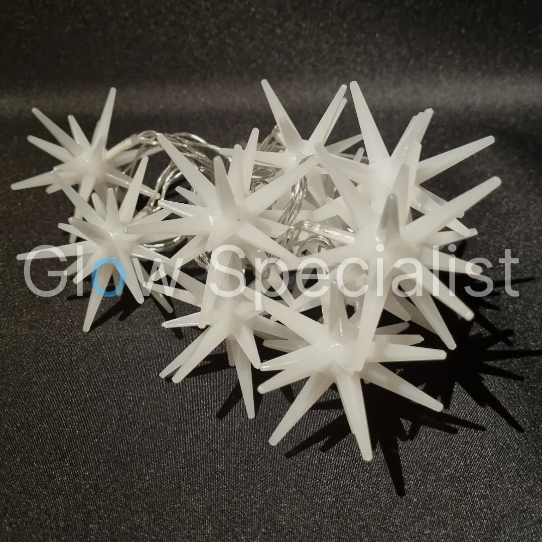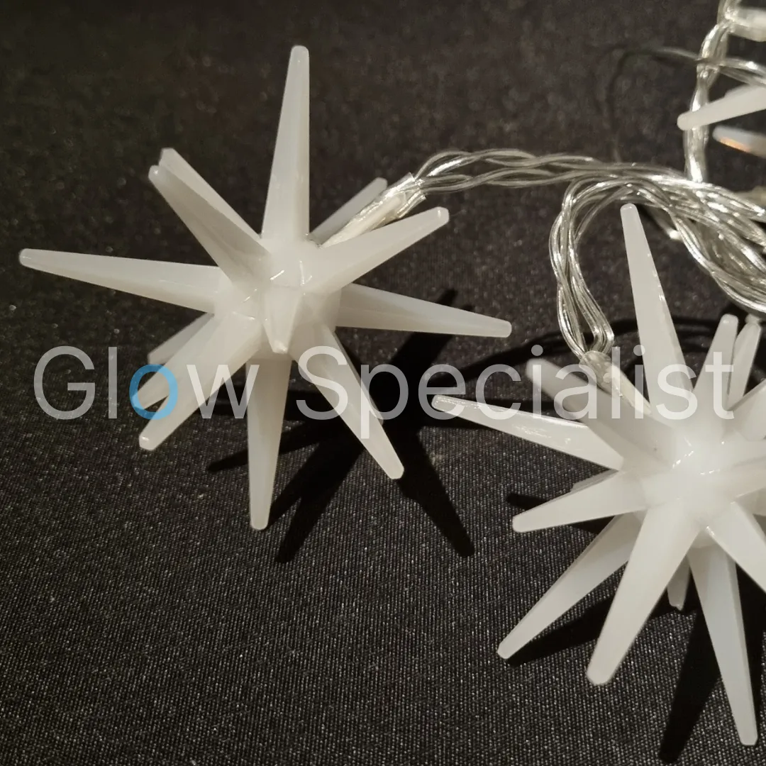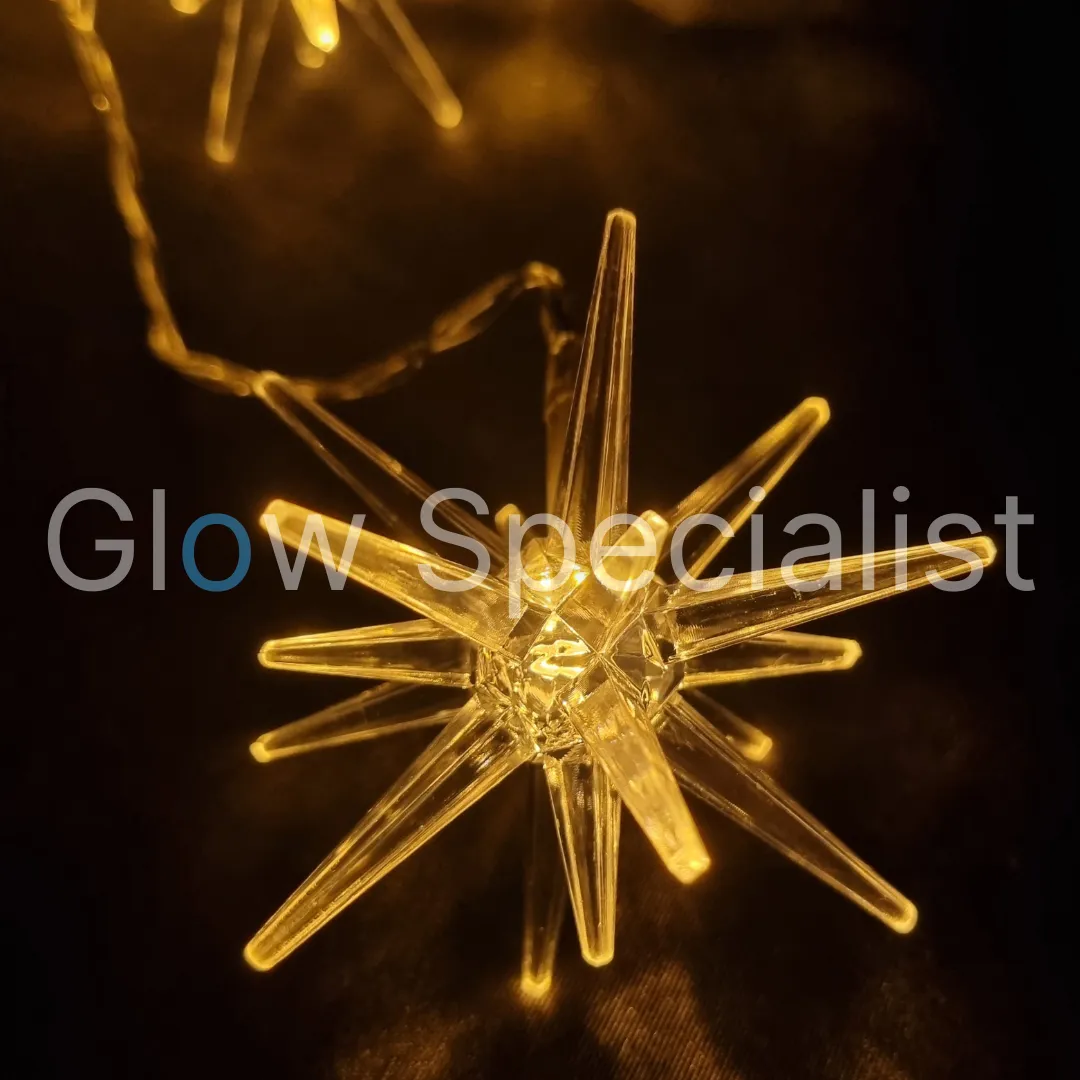 Met 30 cm snoer tot aan de batterijhouder en 15 cm ruimte tussen de lampjes. De sterren hebben een doorsnee van 7,5 cm. We hebben keuze uit twee versies: witte sterren en transparante sterren. De sterren zijn gemaakt van kunststof, maar de witte sterren lijken een soort melkglas en de transparante sterren hebben een glas-look.