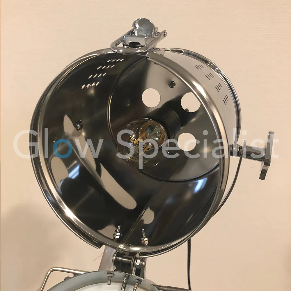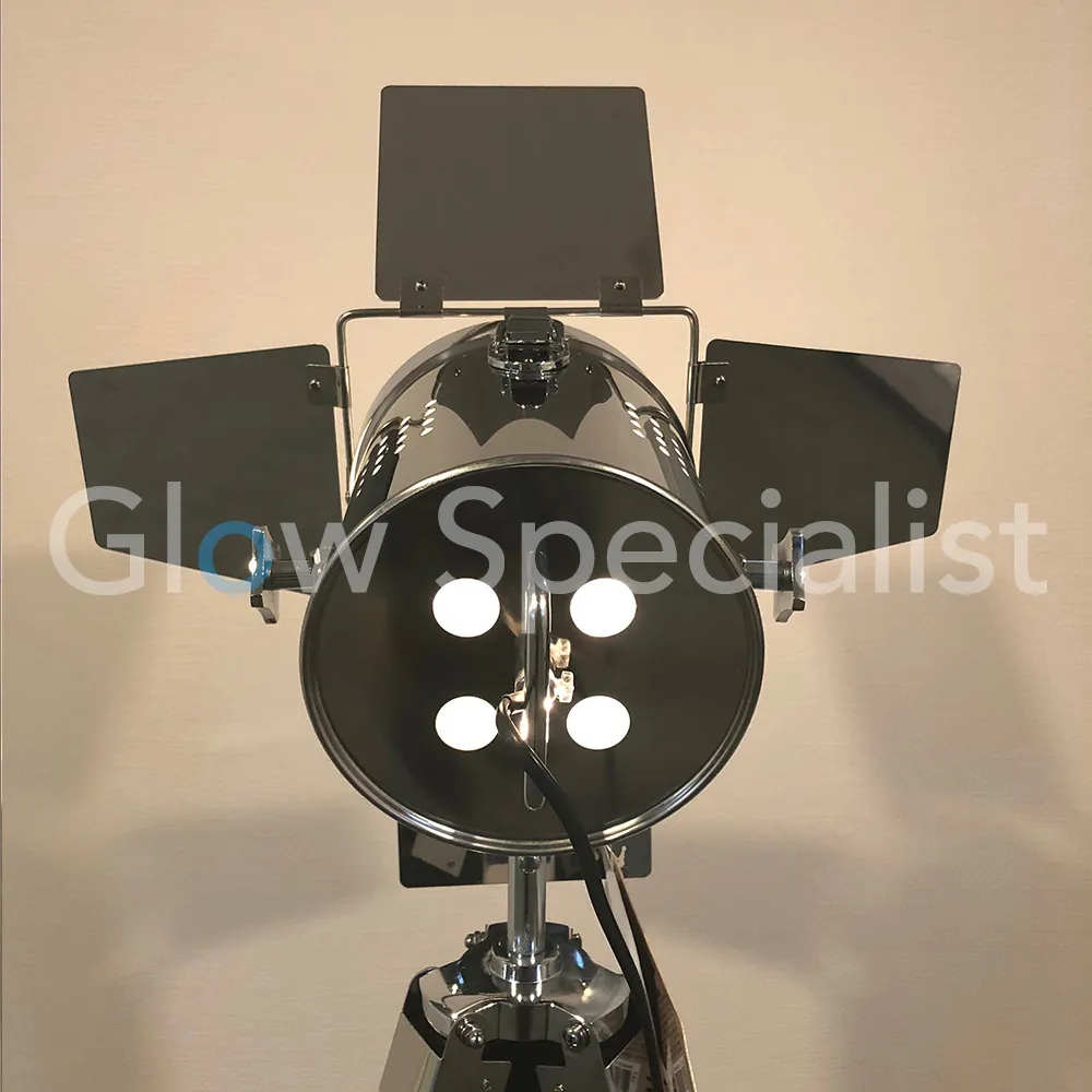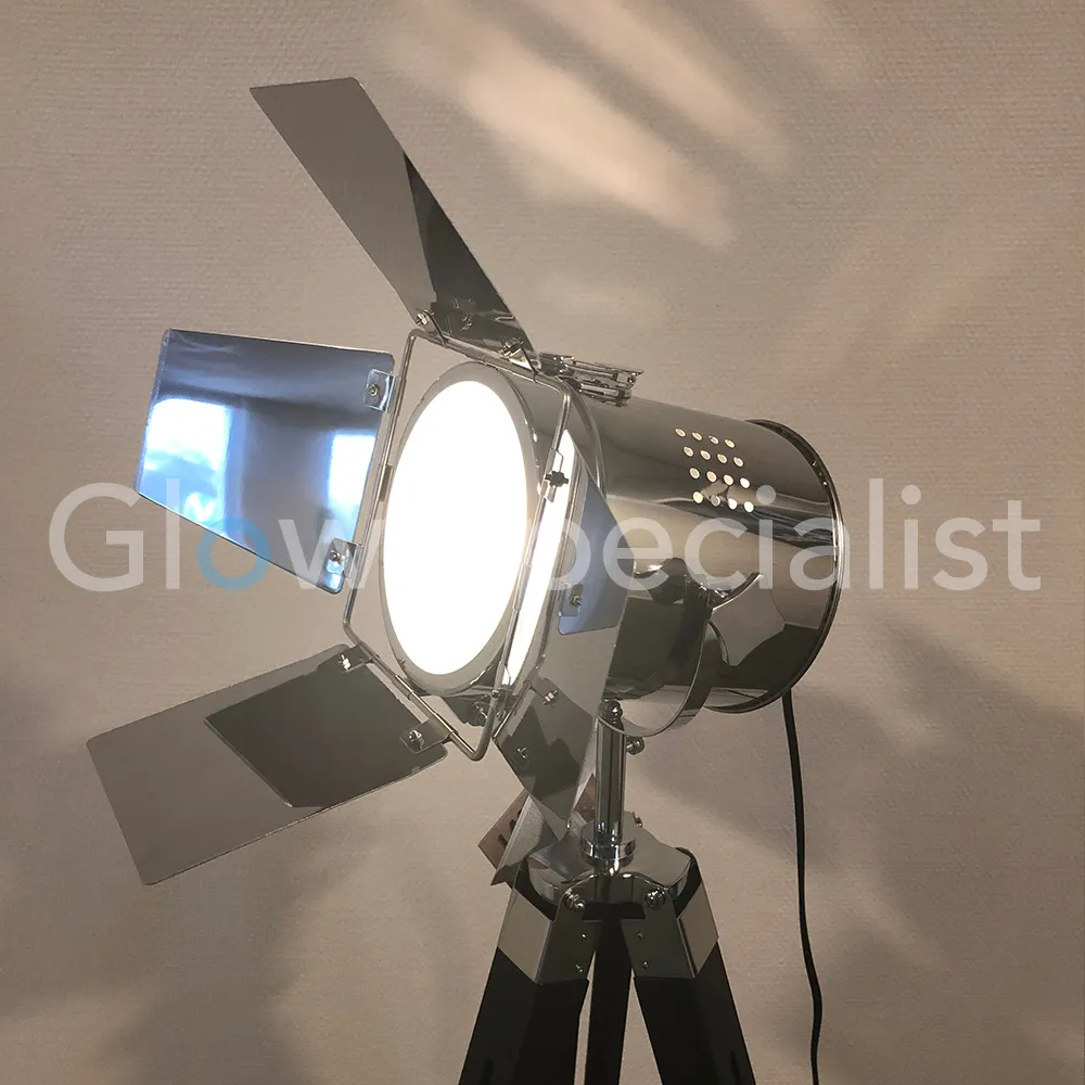 Gemaakt in de stijl van schijnwerpers die filmstudio’s verlichten. De lampenkap en reflector zijn van metaal, de statiefpoten van hout. De lampvoet is verstelbaar. De reflector heeft een soort verstelbare “luiken”. Hiermee kun je de lichtbron instellen. Dit type lamp past ideaal bij het interieur dat is ingericht in een loft, retro of industriële stijl. Lengte netsnoer 3 m.