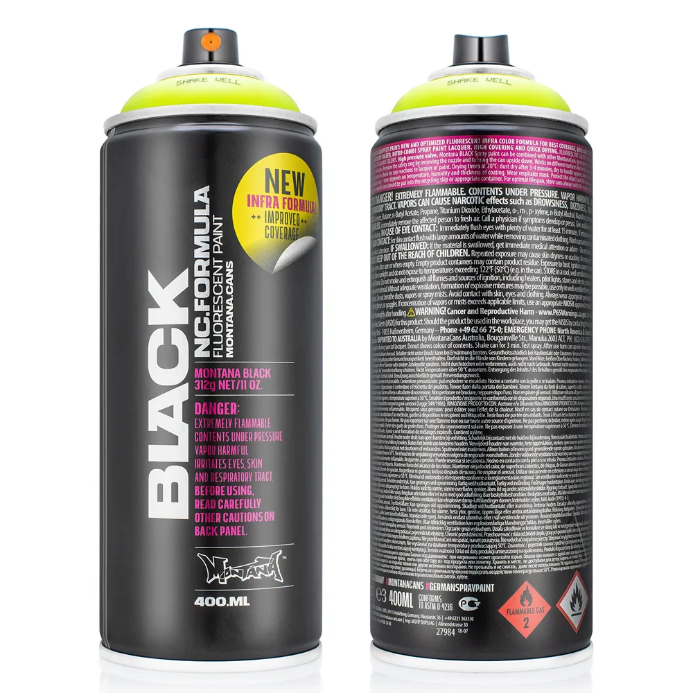 De Montana BLACK INFRA-kleuren, zijn de fluorescerende tinten van de Montana BLACK-serie. De INFRA-serie wordt aangeboden in de kleuren INFRA geel, oranje, rood, roze, violet en groen. Of het hier en daar een highlight is of over een groter oppervlak wordt gebruikt, het INFRA-assortiment kan het verschil maken waarnaar u op zoek bent.