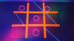In het pakket zitten neon versieringen als wol, tape, en ballonnen. Met het wol span je eenvoudig van het ene voorwerp naar het andere een draad. Bijvoorbeeld aan het plafond, de lampen of de geluidsinstallatie. Met de neon tape versier je ramen, deuren, muren, lampen, meubelen etc. Eigenlijk kun je er alles mee tapen, na het feest is de tape weer eenvoudig te verwijderen. Hij plakt ook op kleding, papier, hout of karton. Wij gebruikten de tape om de sjoelbak mee te versieren, een hinkelbaan te maken op de grond, bekertjes en drinkpakjes mee te beplakken, kortom… alles kun je hiermee lichtgevend maken bij blacklight! Dus UV-lampen aan…en het feest kan beginnen!