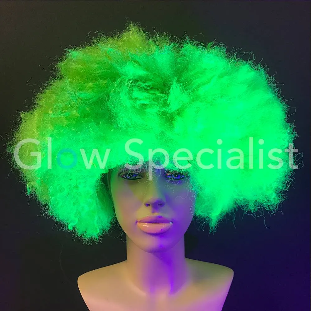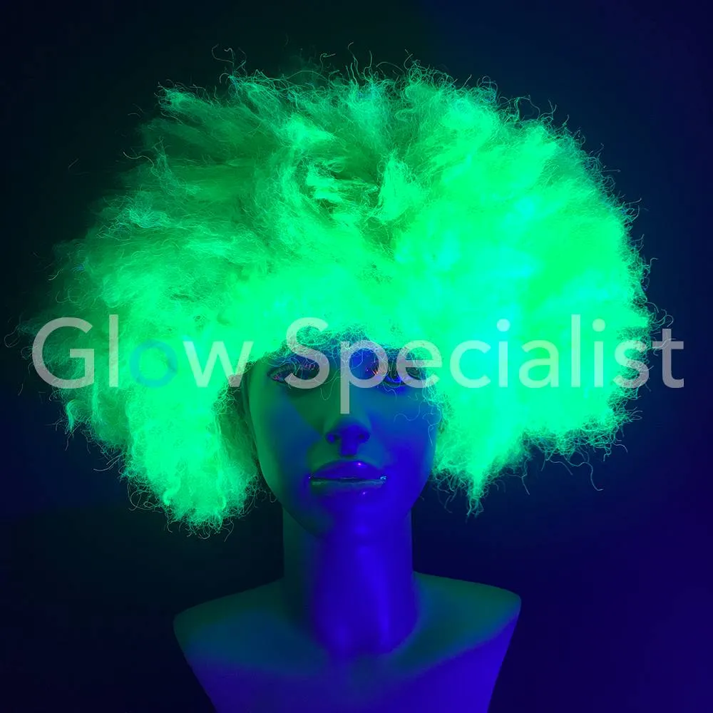Geschikt voor Carnaval, disco/70’s feest en blacklight/glow party’s. Deze feestpruik heeft een afro model met volumineus krullend haar en is fluorescerend bij blacklight.