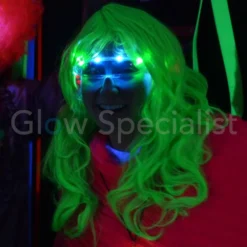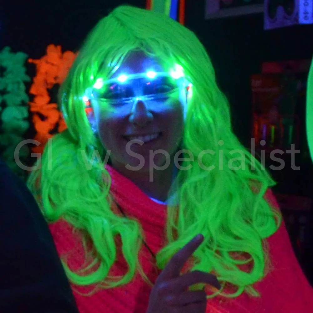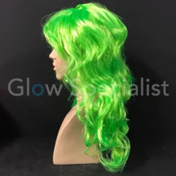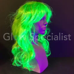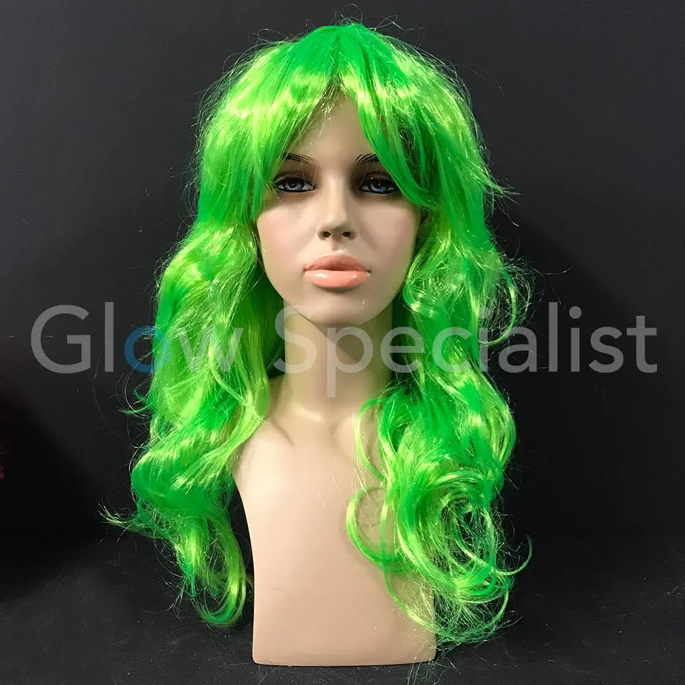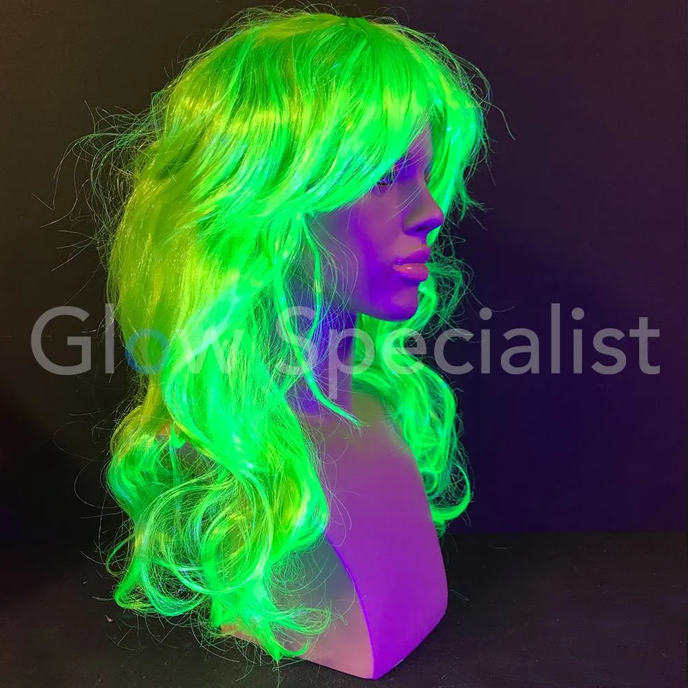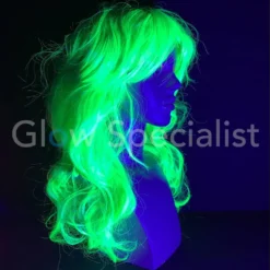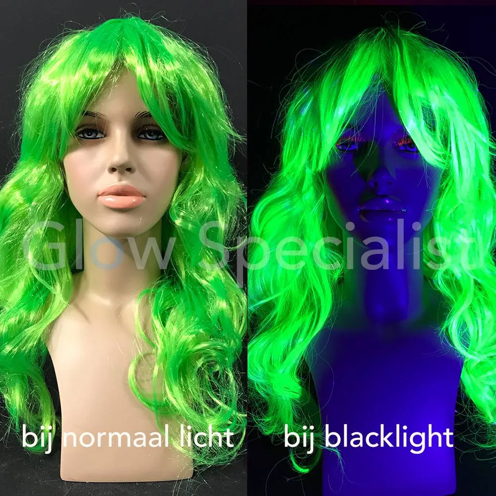 Deze feestpruik heeft een lang model met krullend haar en pony en is fluorescerend bij blacklight.