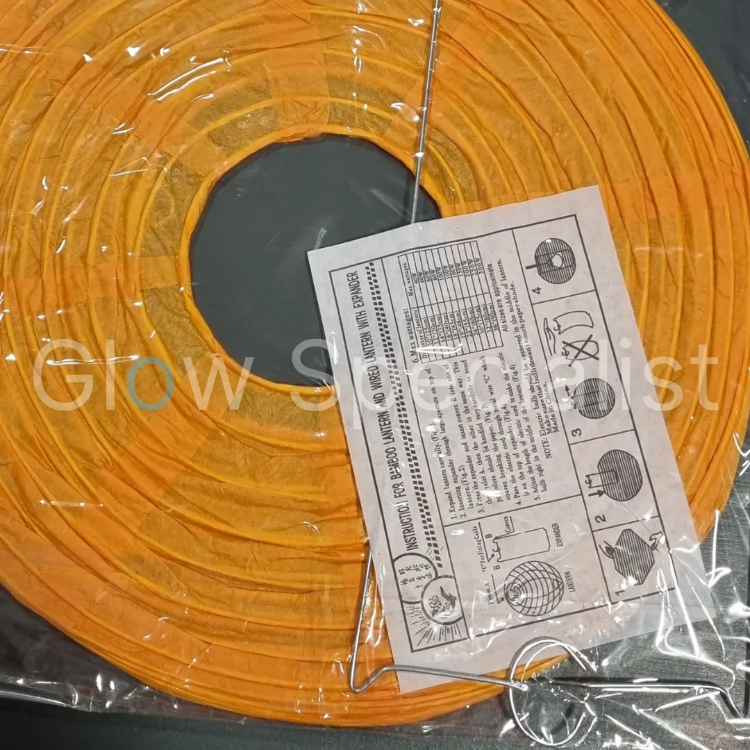 - Materiaal: oranje rijstpapier met metalen spanner met ophanghaakje waaraan je tevens een lampje of glowstick kunt hangen voor verlichting