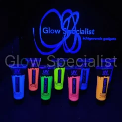 Nu is er deze voordeelset van 8 kleuren. De set bestaat uit 8 tubes van de meest gevraagde kleuren: rood, blauw, geel, roze, groen, wit, paars en oranje. De schmink is kant-en-klaar en eenvoudig aan te brengen met je vingers, sponsje of heel precies met een kwastje. De paint is makkelijk in gebruik en wordt veel gebruikt voor UV party’s, neon feesten en glow events. Leuk om te combineren met onze andere blacklight cosmetica en glitters.