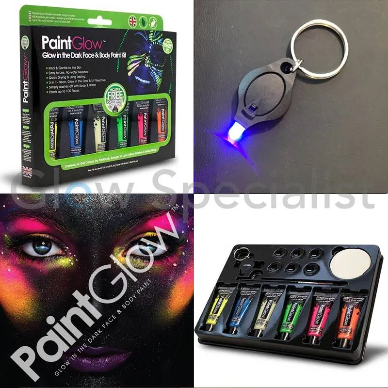 Deze Glow in the Dark Paint Kit is een geweldige verzameling van onze allerbeste Glow in the Dark Paints met veel extra goodies. De paints zijn neon in normaal licht, UV reactief bij Blacklight en Glow in the dark wanneer ze opgeladen zijn (en de omgeving donker genoeg is). Inclusief een penseeltje, spons, UV lampje, geintegreerd mengpalet en een tutorial boekje. Alles wat je nodig hebt in een handige kit.