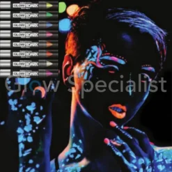 Deze dikke Glow in the dark paint stick is beschikbaar in 8 neon kleuren: geel, groen, blauw, roze, oranje, rood, paars en de 8-ste kleur is onzichtbaar. Kleuren zoals geel, groen, roze en oranje zijn heldere kleuren. Kleuren zoals rood, blauw en paars lichten bij blacklight minder fel op en worden als contour of ondersteunende kleuren gebruikt.