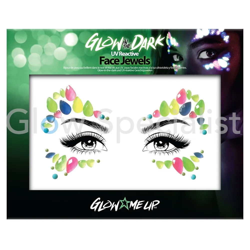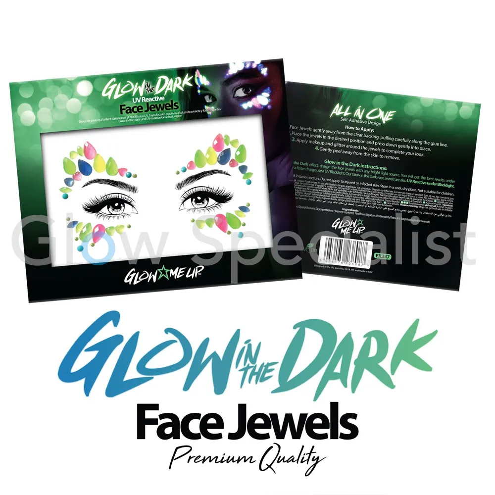 Je hoeft ze alleen van het velletje af te halen en kunt ze direct op je gezicht plakken. Niet één voor één, maar met meerdere steentjes tegelijk. Ideaal voor Halloween, een gala of thema feest, zoals een Glow of Neon party. Want behalve dat de Face jewels glow in the dark zijn, lichten ze nog mooier op bij UV licht (blacklight). En je kunt ze na je feest gewoon weer terugplakken en een volgende keer hergebruiken. Wanneer ze niet goed meer plakken, gebruik je het beste Paintglow glitter fix gel.