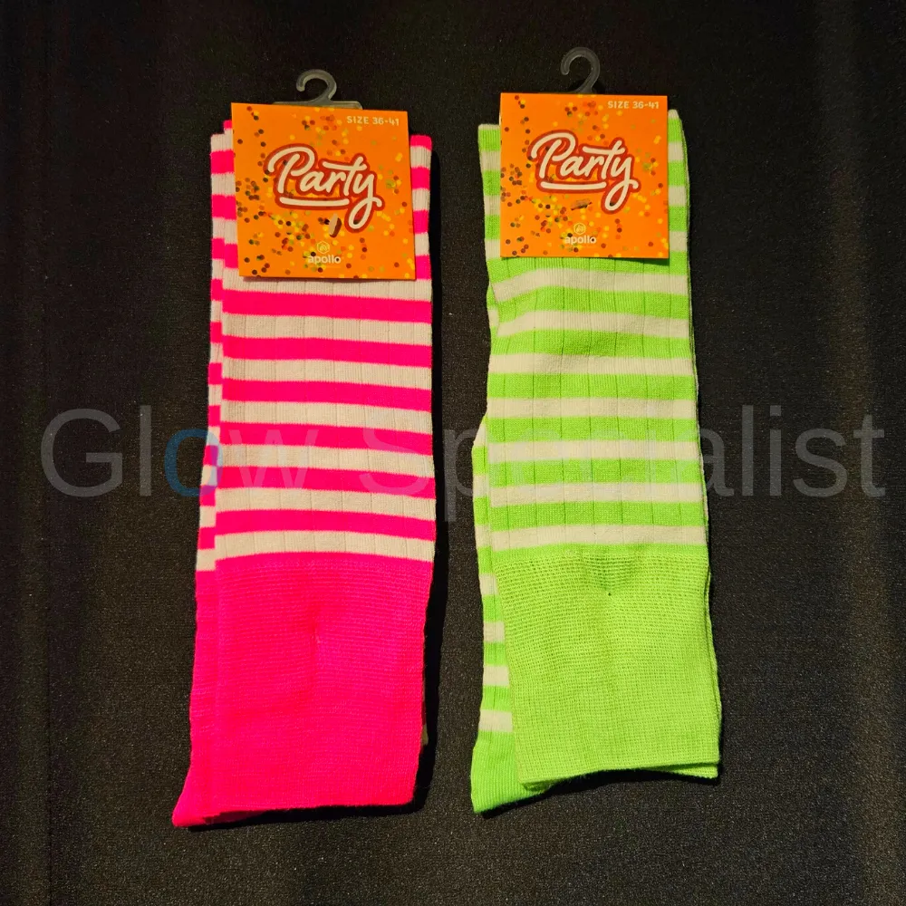 Noem je het kniekousen, voetbalsokken of sportsokken? Met deze gestreepte fluor kousen maak je je outfit helemaal af.