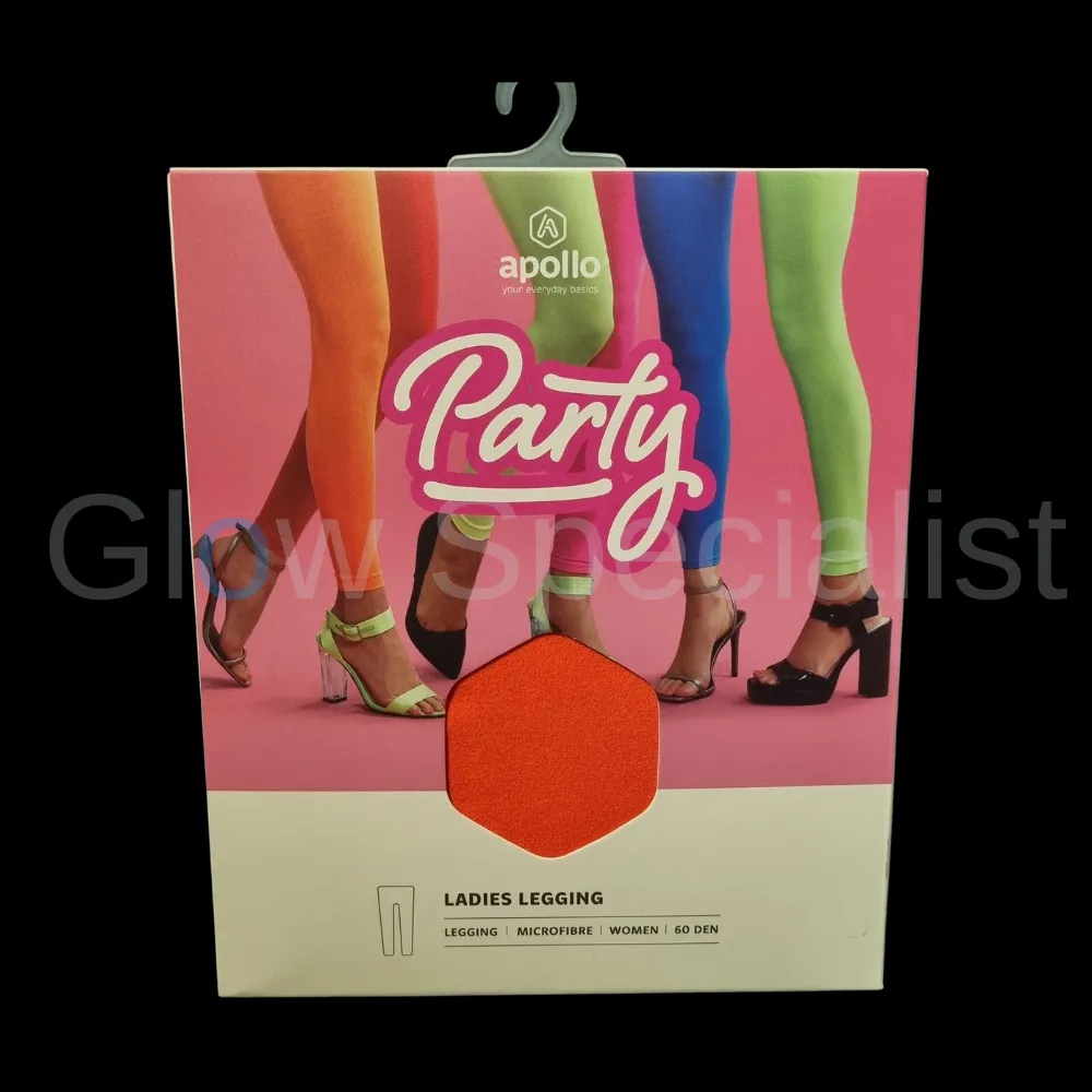 Goede kwaliteit fluor oranje legging met een hoog draagcomfort. De legging is elastisch en heeft een tailleband. Dikte: 60 denier. De legging is gewoon glad en heeft dus geen werkje. Zodra je in blacklight staat licht de legging fluorescerend op. Geweldig op een Glow feest of neon party.