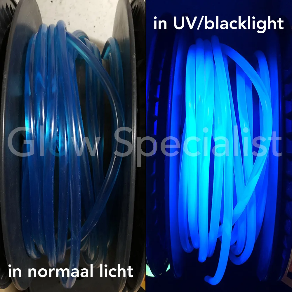 Zeer decoratief UV draad met een dikte van 8 mm (de dikste variant), verkrijgbaar in 4 kleuren. Gemaakt van zacht PVC dus buigzaam in vele vormen. Je kunt er de leukste dingen mee doen. Span het draad langs objecten of hang het aan het plafond, schrijf ermee of lijm het vast. Zodra er UV/blacklight licht op schijnt wordt het draad lichtgevend. Leuk als decoratie op een neon feest of blacklight party.