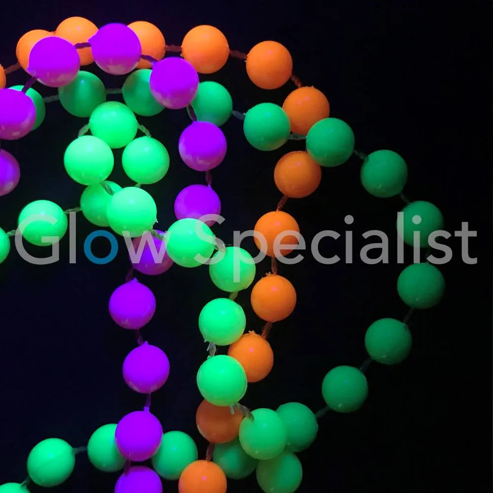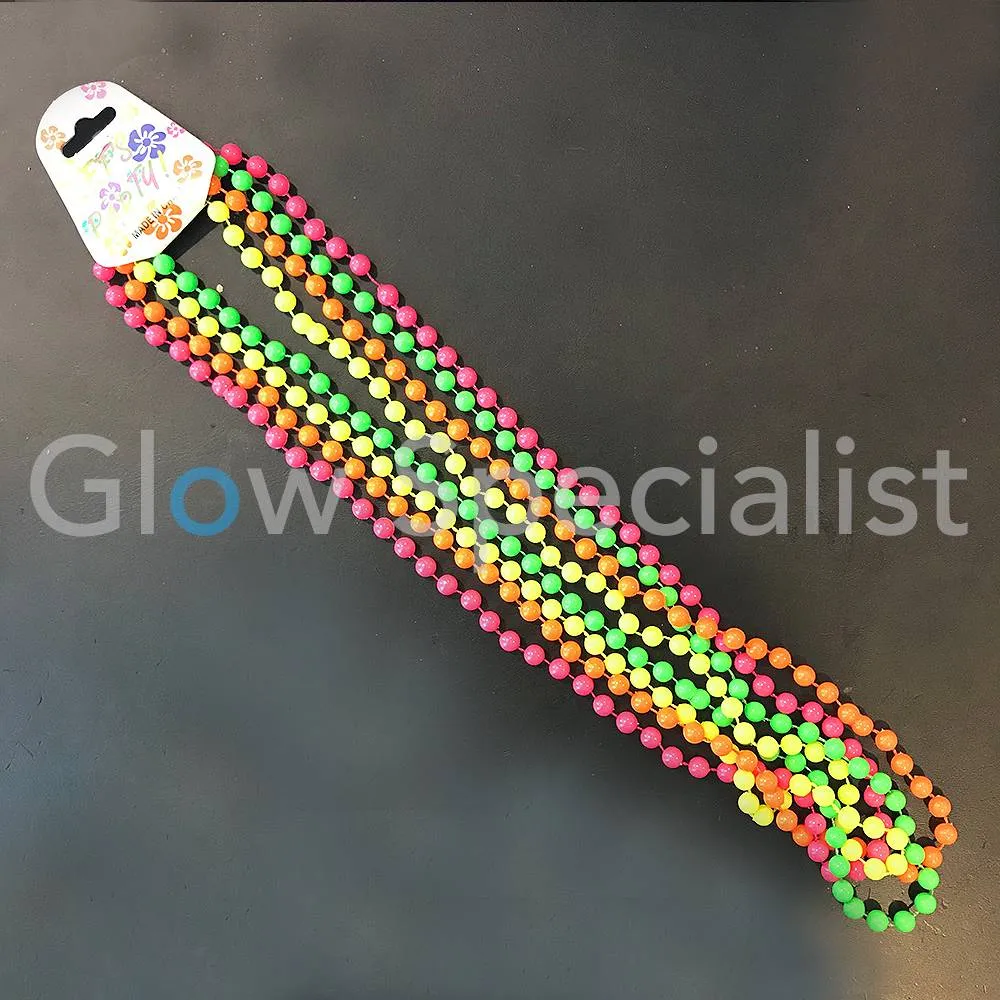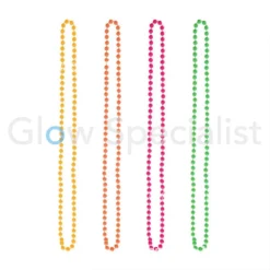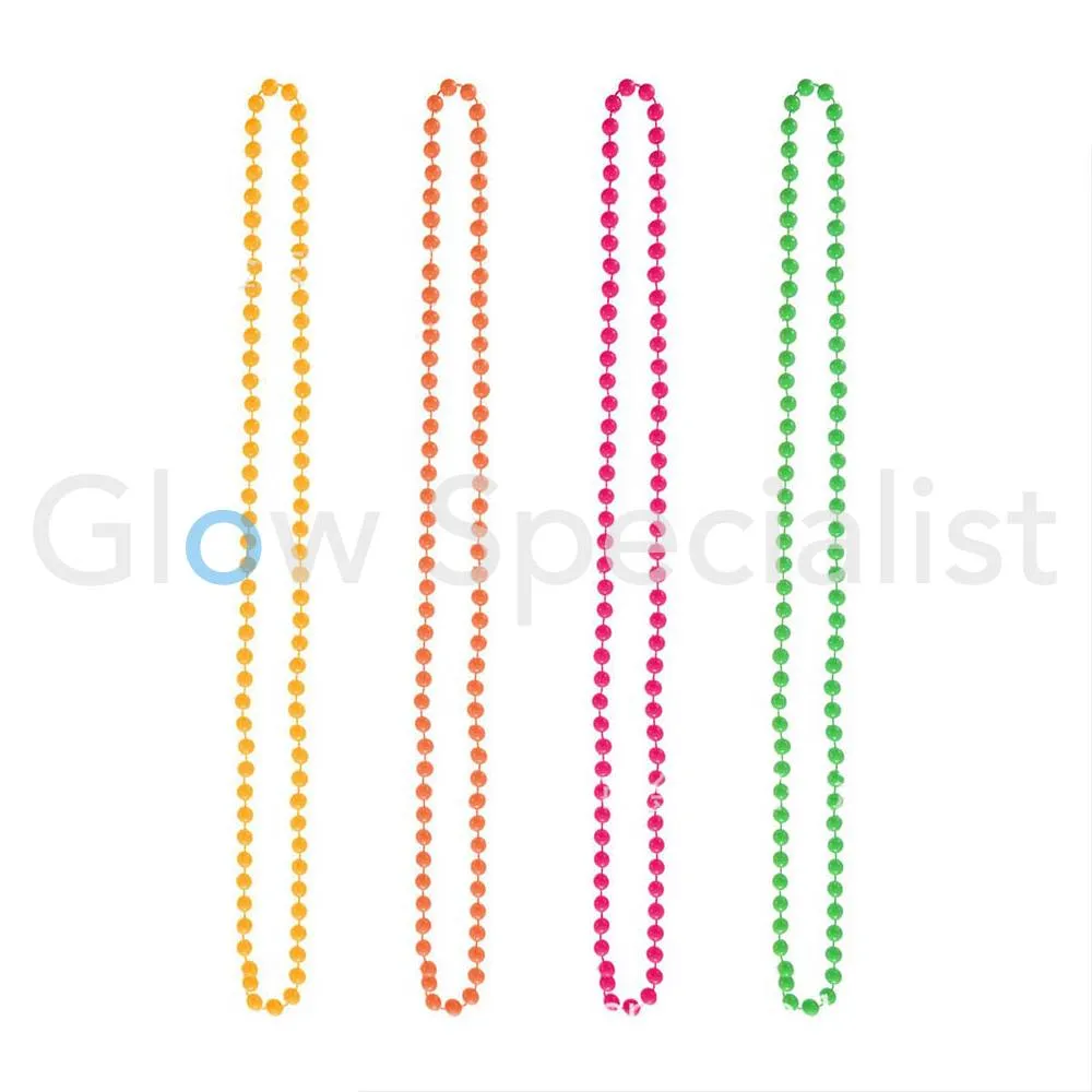 Set van 4 neon fluorescerende kralenkettingen. Leuke accessoire voor een jaren ’80 of retro 90’s themafeest, disco of neon party. De kettingen lichten op bij blacklight.