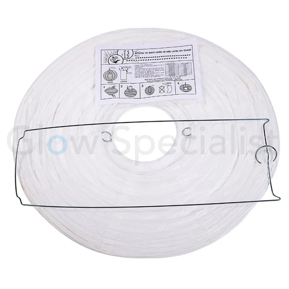 - Materiaal: wit rijstpapier met metalen spanner met ophanghaakje waaraan je tevens een lampje of glowstick kunt hangen voor verlichting