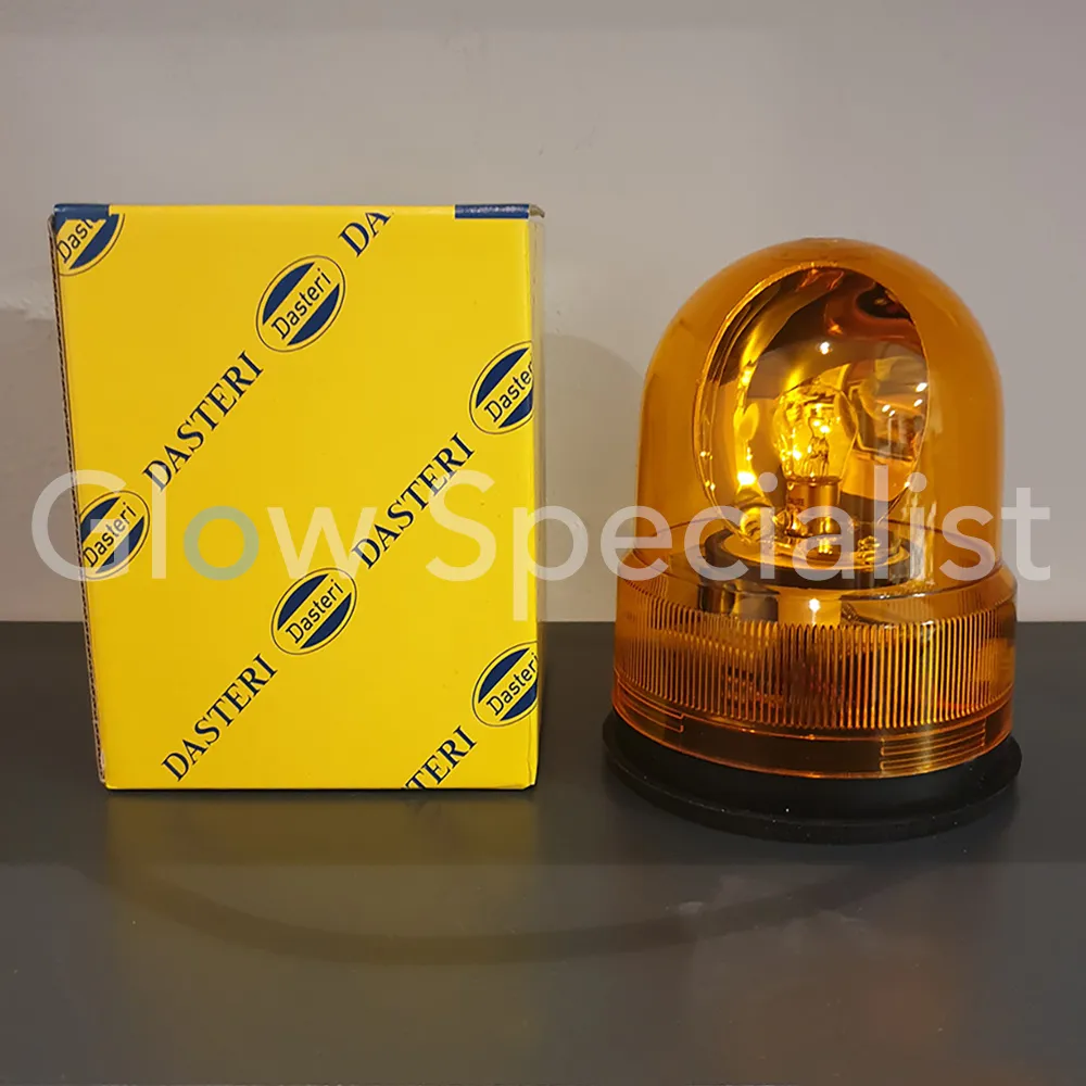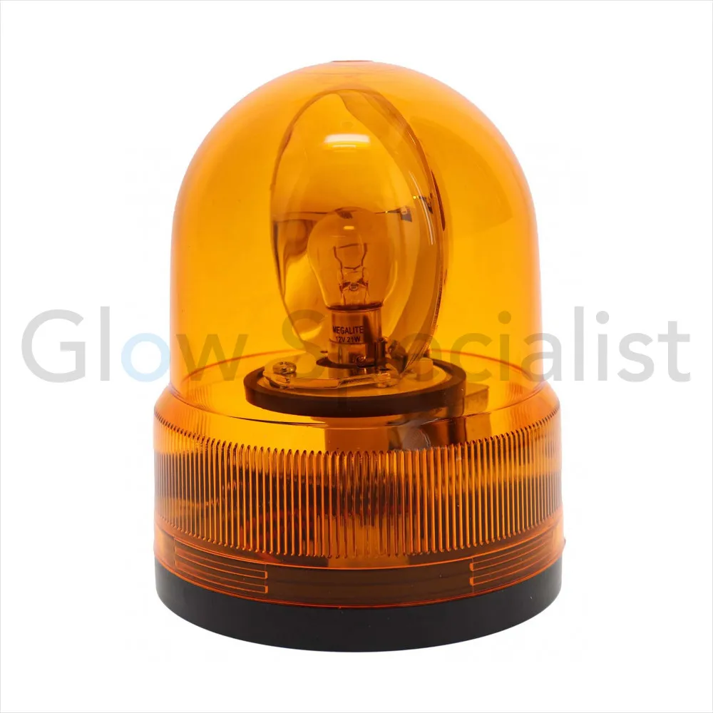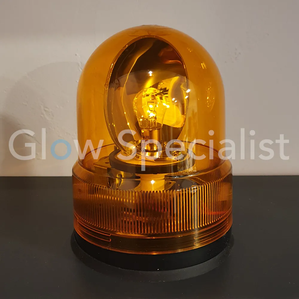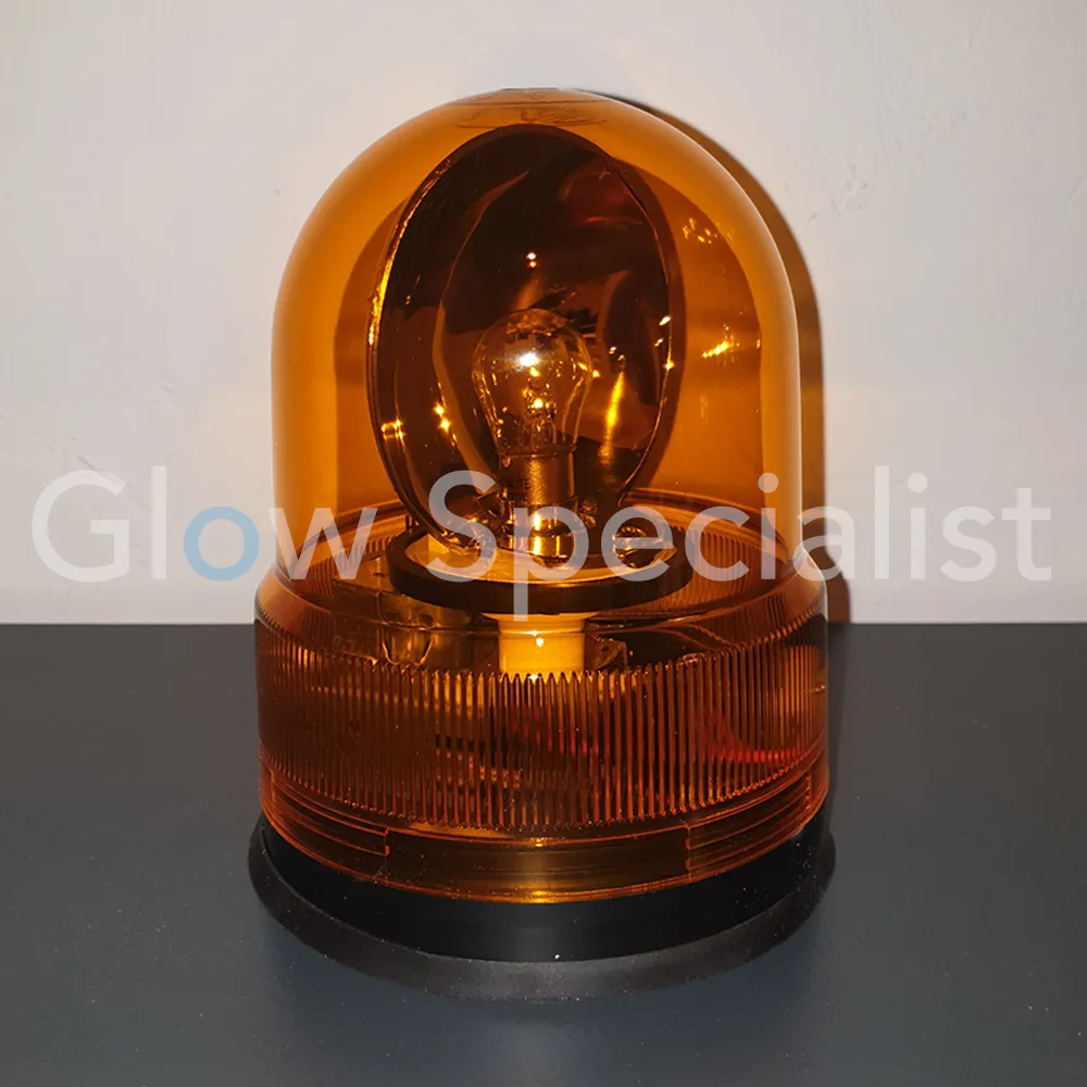Oranje lamp met het welbekende zwaailicht effect. Een speciale reflector roteert rondom de lamp. Met halogeen H21-lampje. De lamp wordt geleverd zonder stekker.