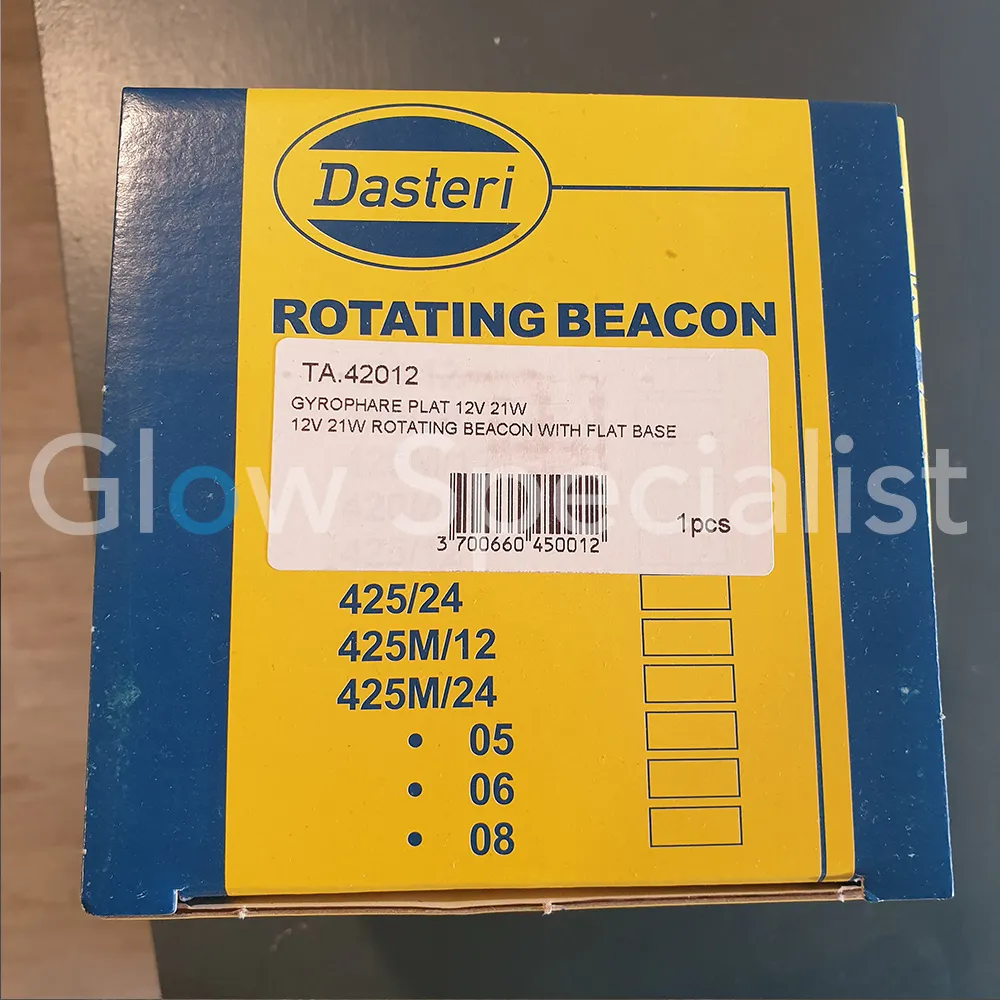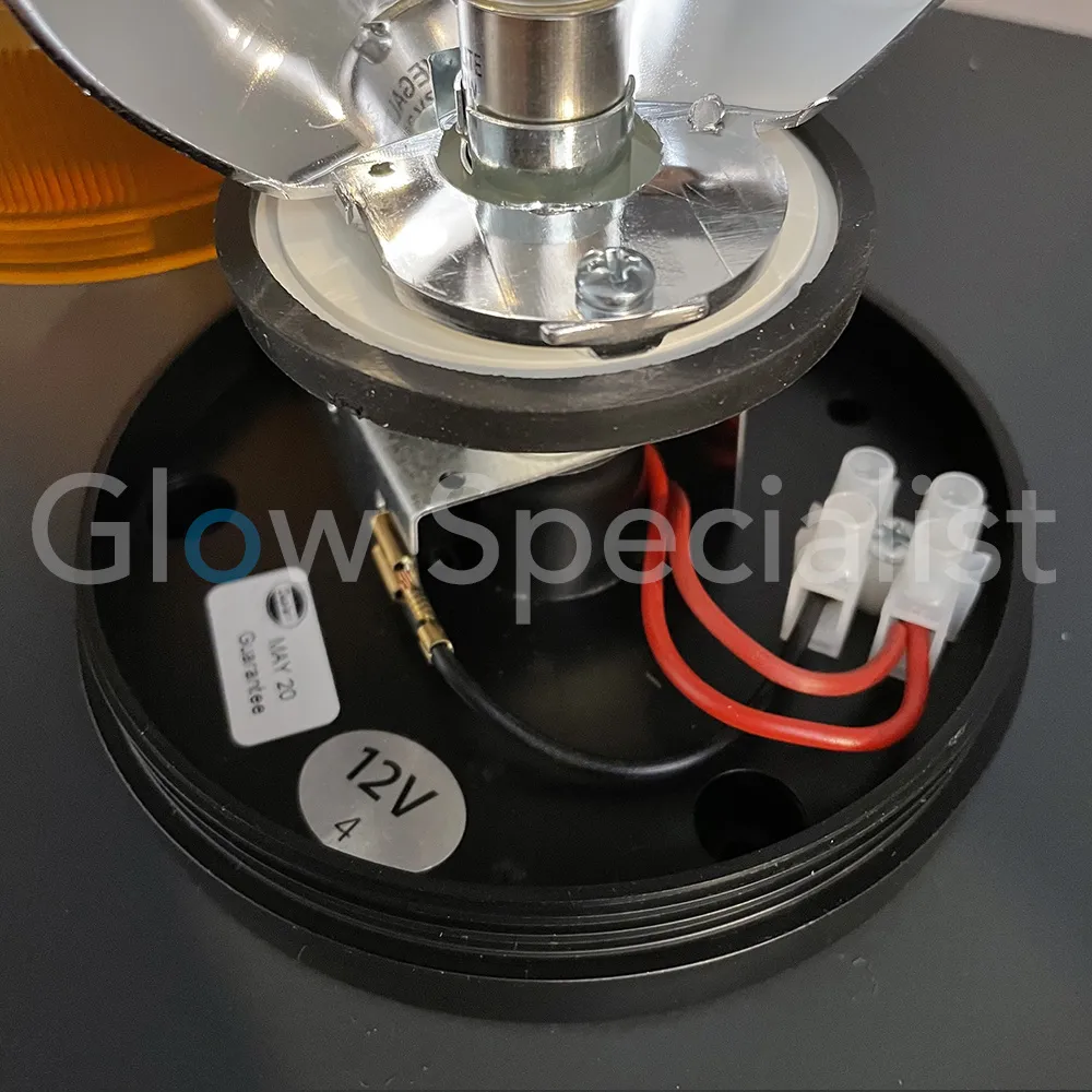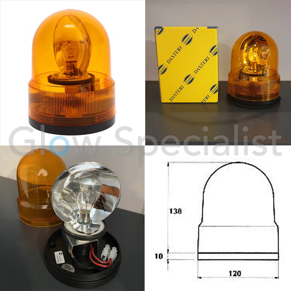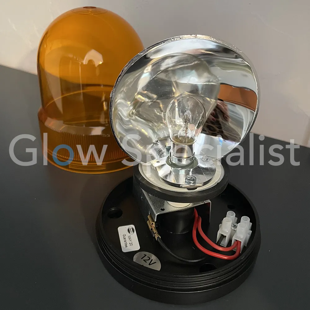 Oranje lamp met het welbekende zwaailicht effect. Een speciale reflector roteert rondom de lamp. Met halogeen H21-lampje. De lamp wordt geleverd zonder stekker.